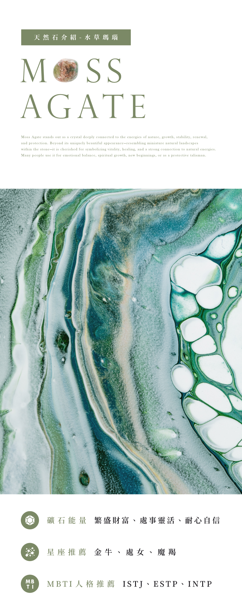 在能量寶石愛好者之間,水草瑪瑙常被稱為「繁盛之石」或「自然守護石」,象徵成長、穩定與財富累積。它外觀清靈自然,能量溫和卻踏實,非常適合作為生活與事業的長期陪伴。須注意,不同個體對水草瑪瑙的能量感受會有所不同,上述資訊僅供參考,請依自身需求選擇最合適的方式喔!