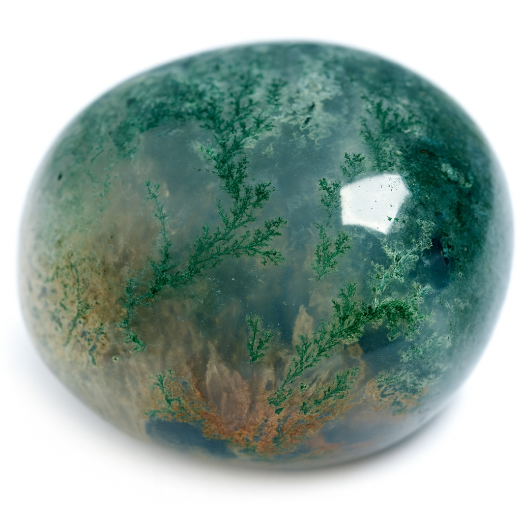 水草瑪瑙(Moss Agate)是一種外觀清透、內含如水草、苔癬般紋理的天然瑪瑙。雖然名稱中有「瑪瑙」,但嚴格來說它是含有綠泥石、氯化物等礦物包體的隱晶質石英。色澤多以透明或乳白為基底,內部的綠色紋理形態獨特,每一顆都如同自然景觀的縮影。莫氏硬度約為 6.5–7,適合日常配戴。主要產地包含印度、美國、巴西、澳洲等地。