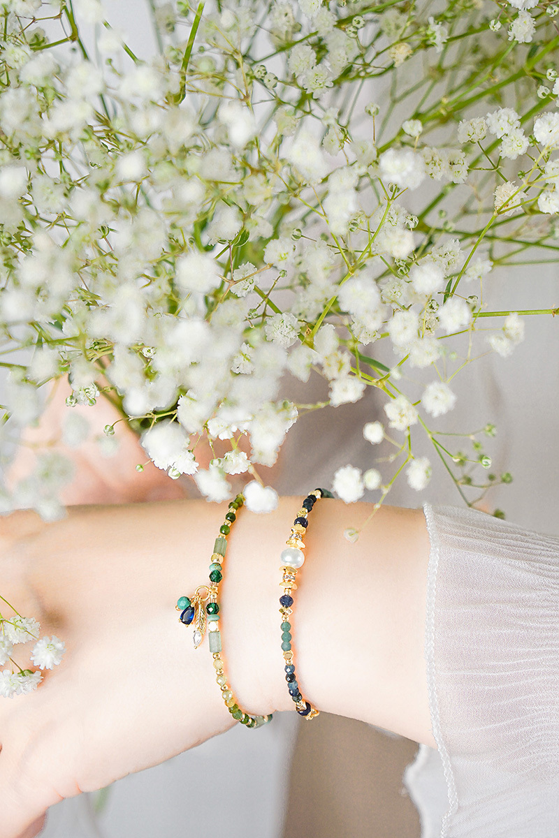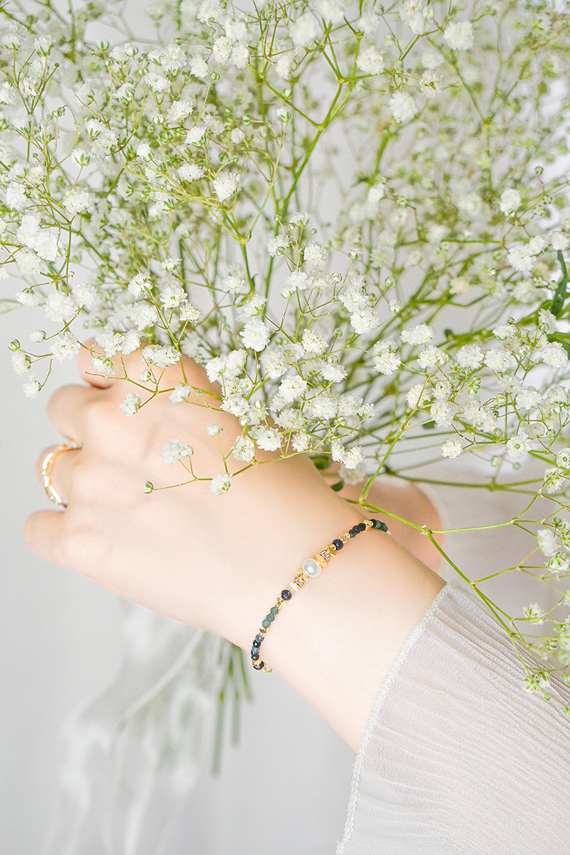 珍珠、墨藍玉髓、藍碧璽、黃銅鍍18K金