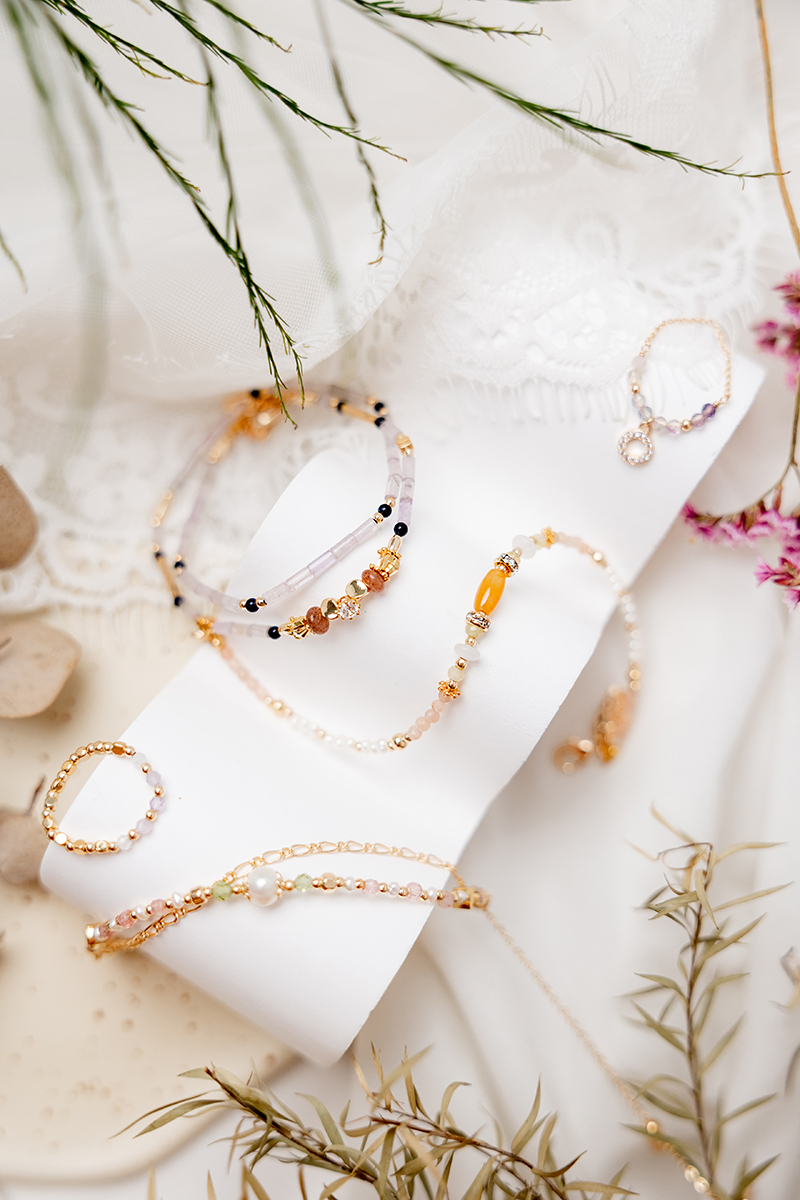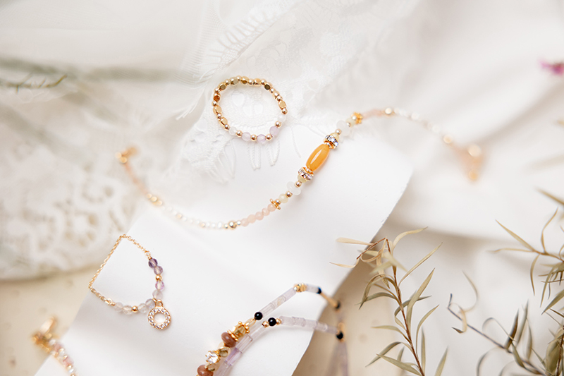 黃玉、黃蛋白石、白玉、太陽石、珍珠、黃銅鍍18K金