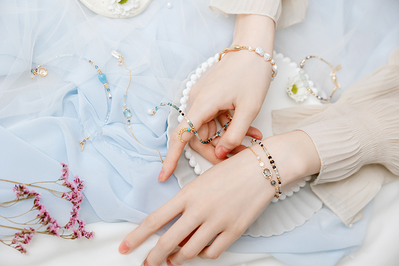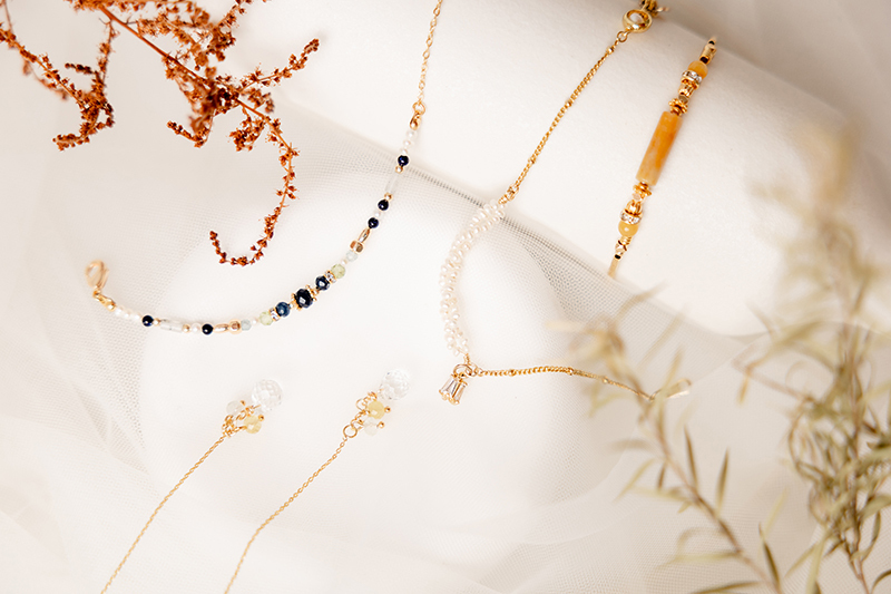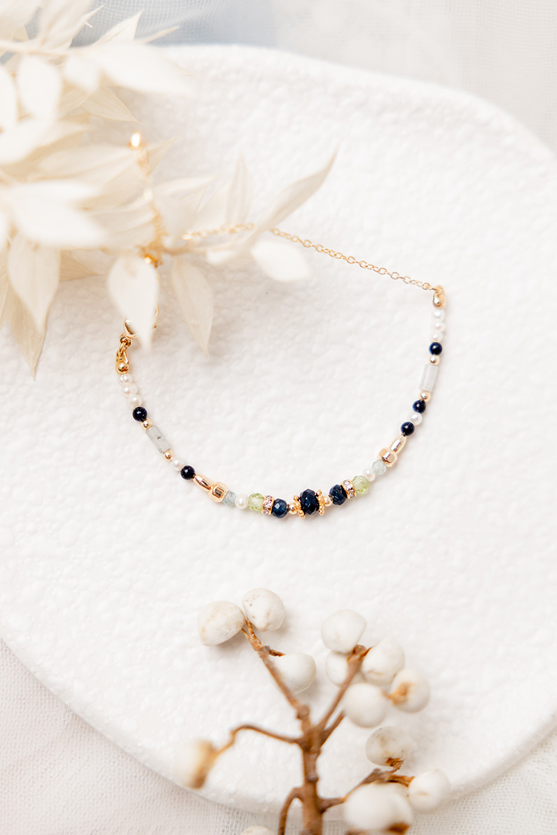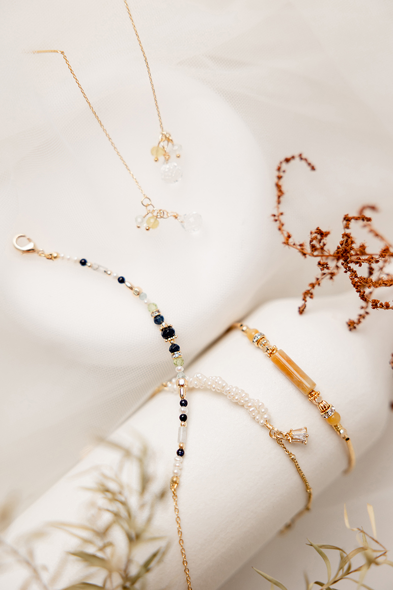 墨藍玉髓、橄欖石、海藍寶、藍金沙、拉長石、黃銅鍍18K金