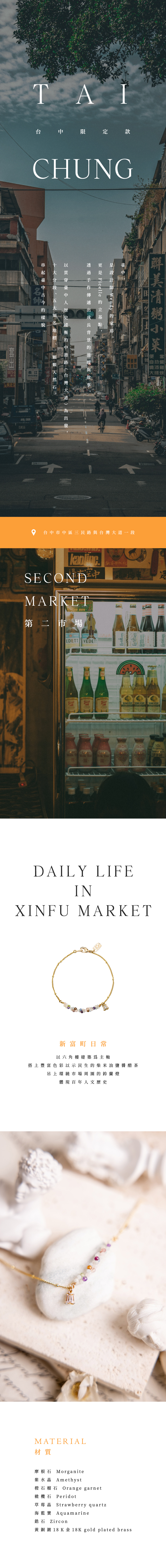 台中,是設計師Wendy的家鄉,本系列以貫穿台中人歷史縱橫的中港路(台灣大道)為出發,十大分段、五大知名地標、一顆顆天然石,串起台中古今的樣貌。