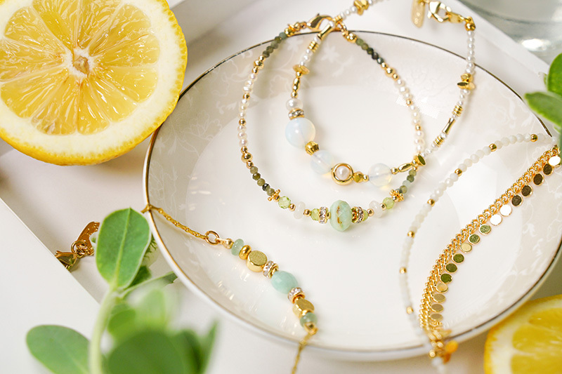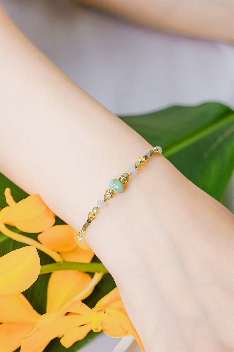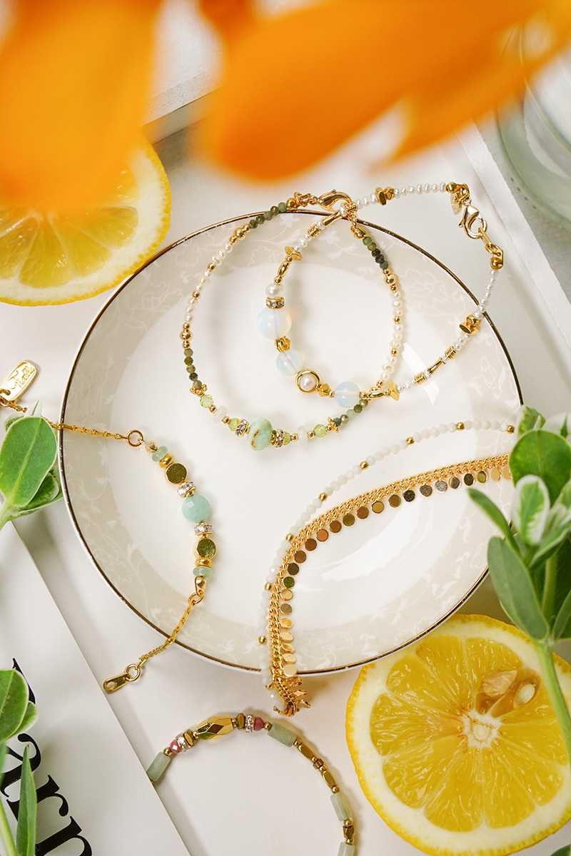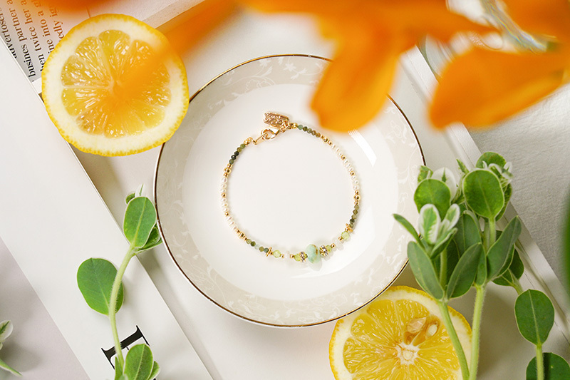 玉、白玉、橄欖石、綠碧璽、淡水珍珠、黃銅鍍18K金