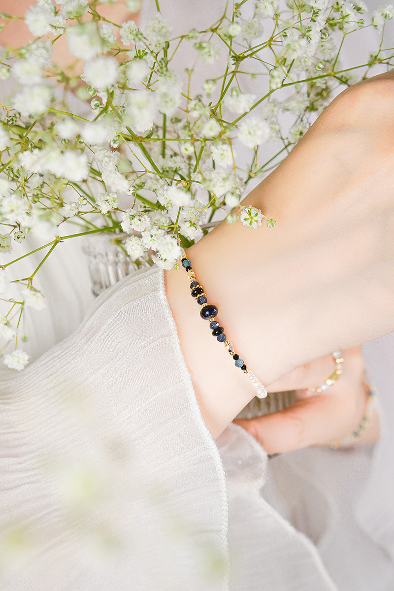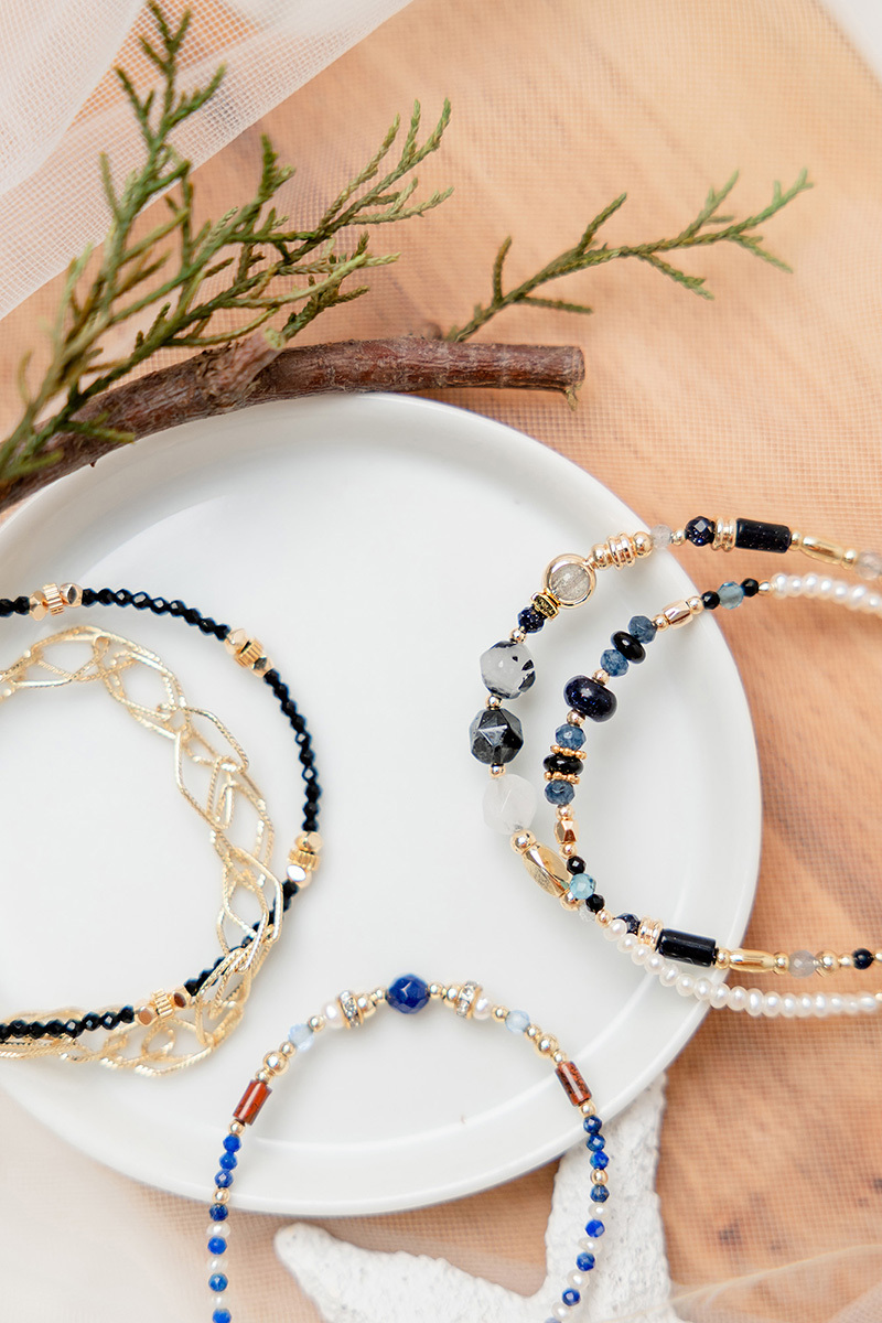 藍金沙、墨藍玉髓、黑瑪瑙、托帕石、尖晶石、珍珠、黃銅鍍18K金