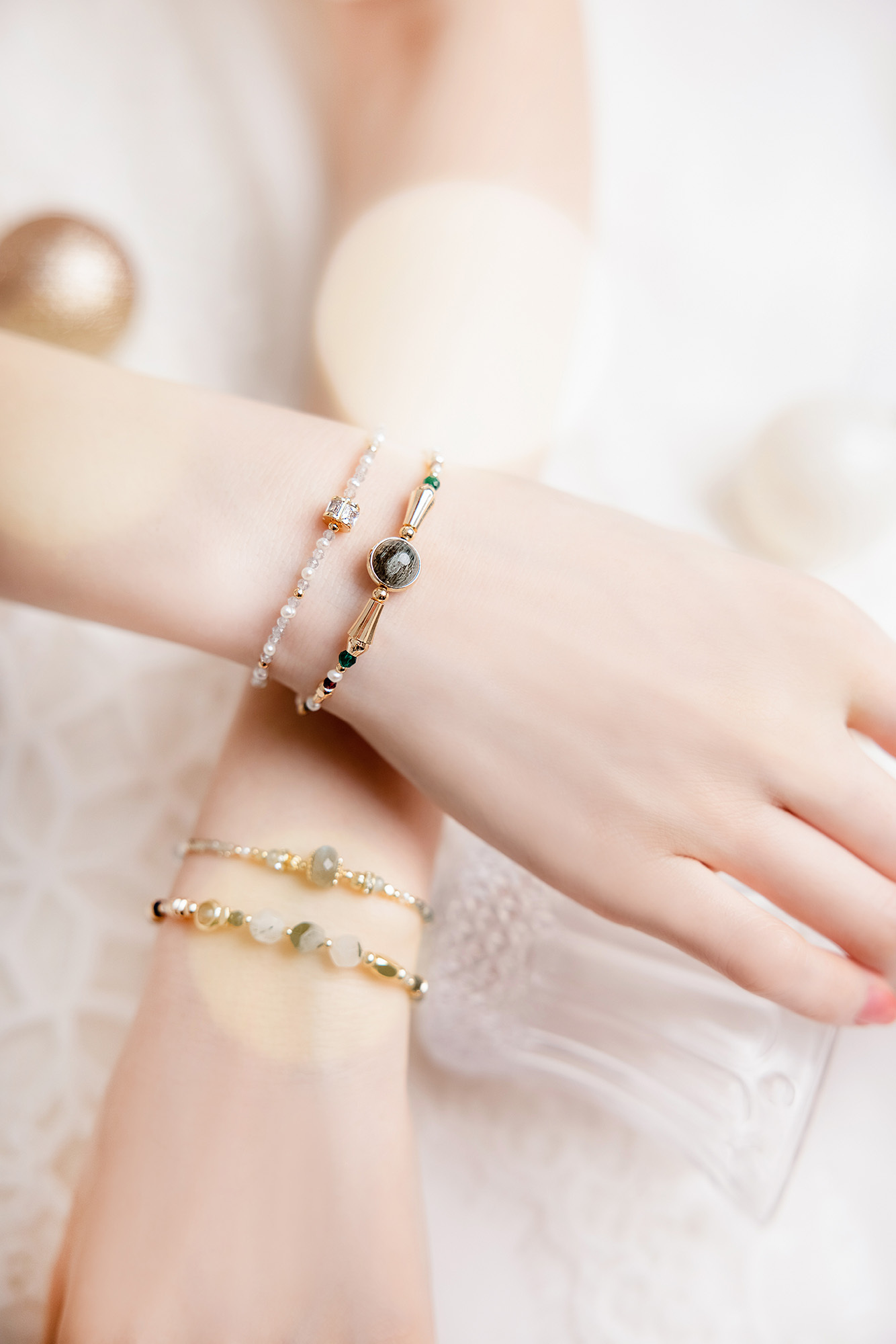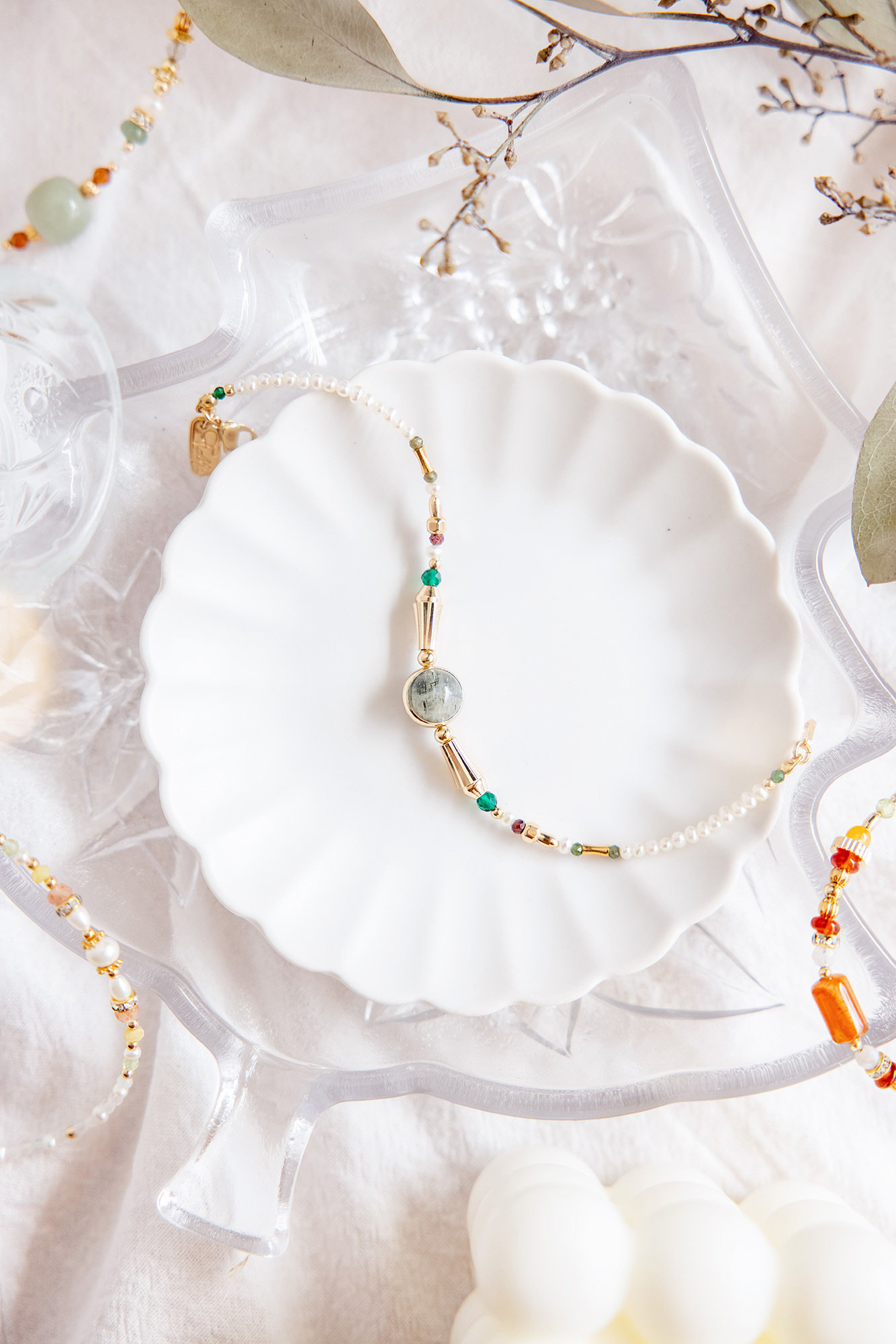 綠幽靈、祖母綠、石榴石、綠碧璽、珍珠、黃銅鍍18K金