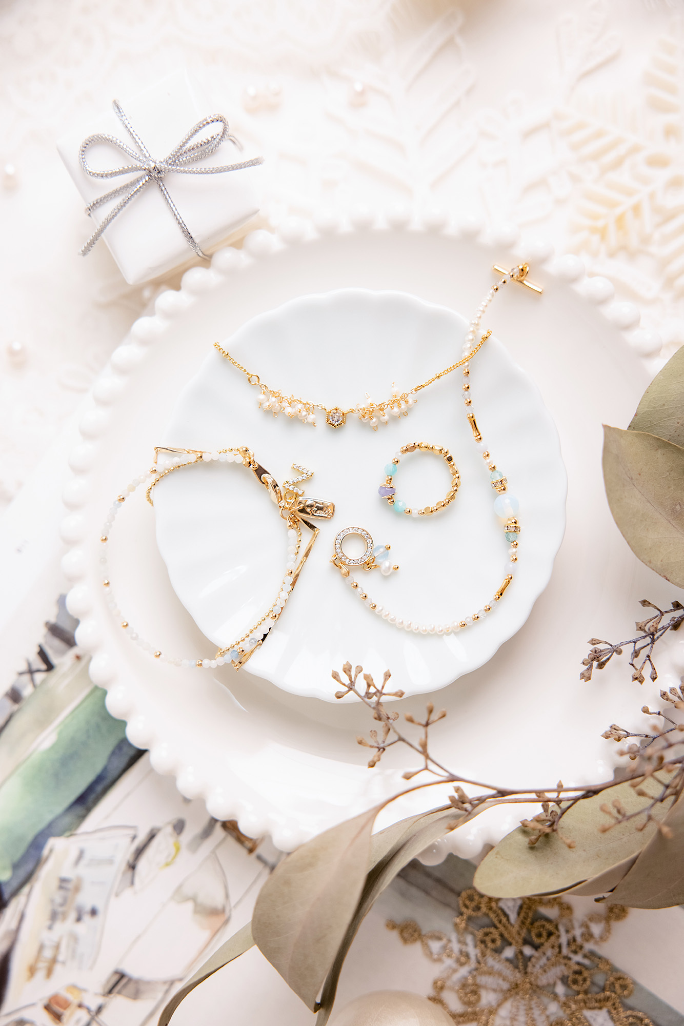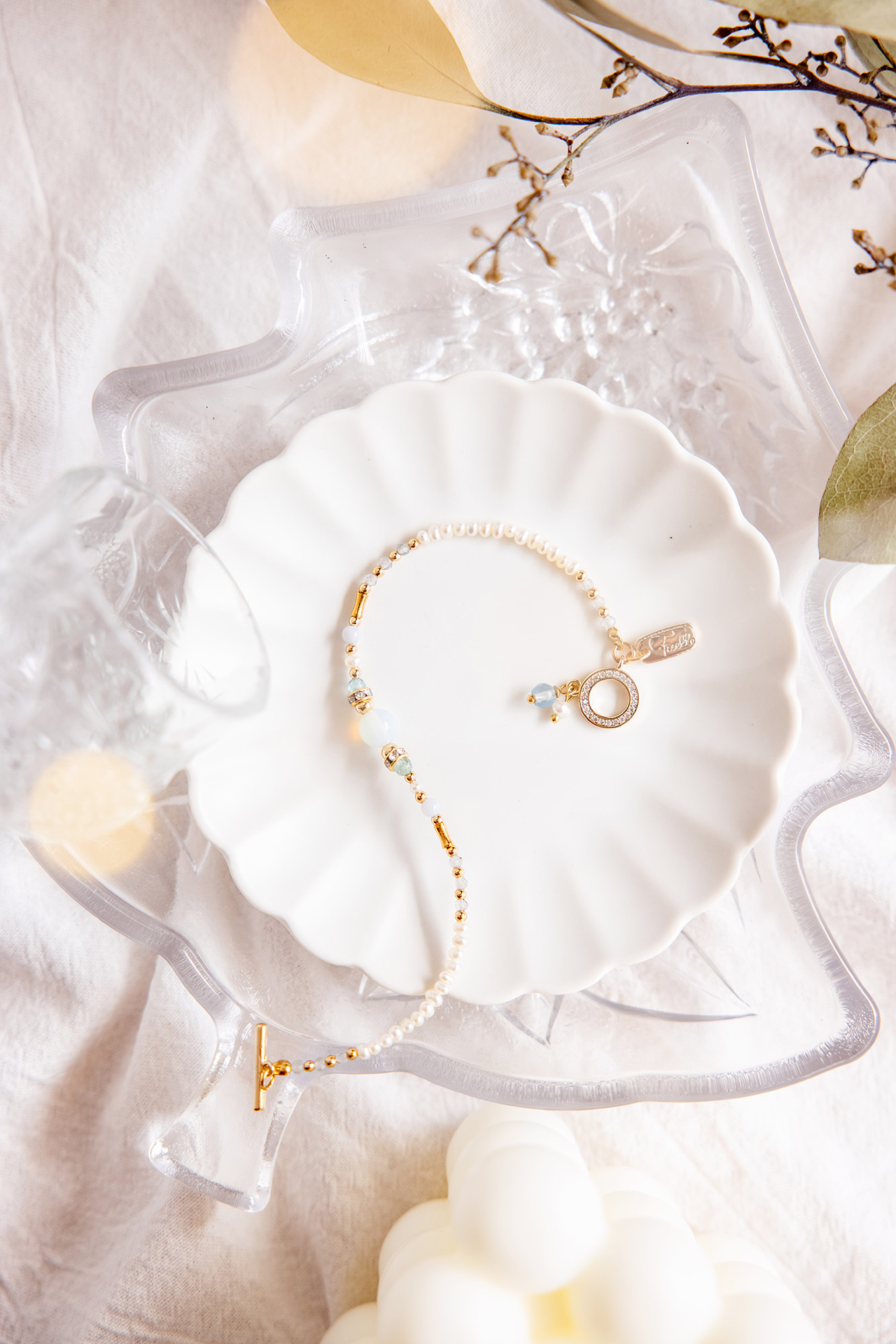 蛋白石、包14K金微鑲鋯石滾鑽、磷灰石、珍珠、藍紋瑪瑙、拉長石、海藍寶、鋯石、黃銅鍍18K金