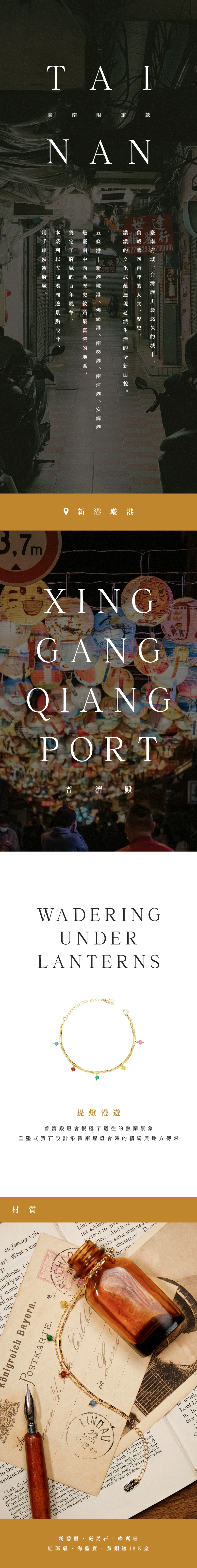 臺南府城,臺灣歷史最悠久的城市,負載著400年的人文、歷史,濃濃的文化底蘊展現老派生活的全新面貌。本系列以五條港周邊景點設計,用手串慢遊府城。
