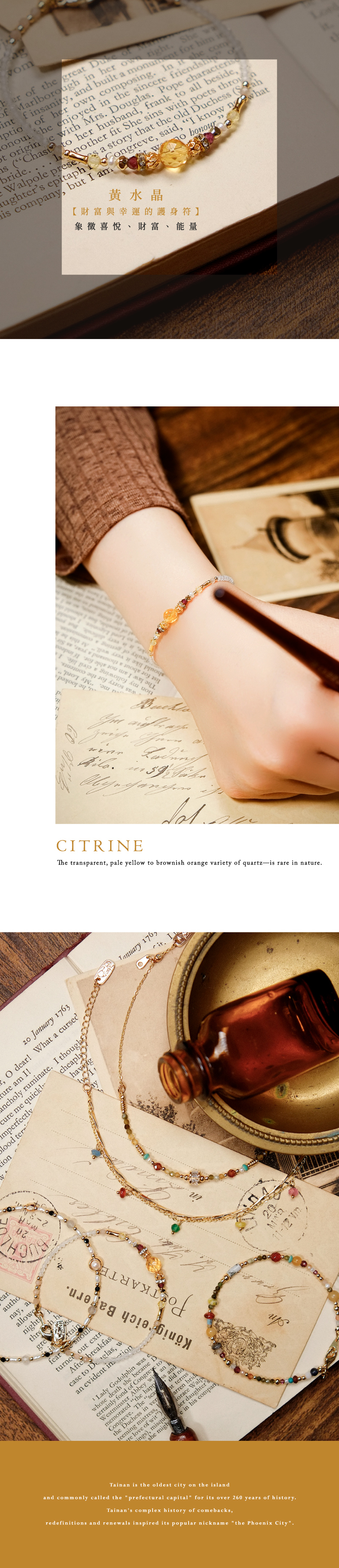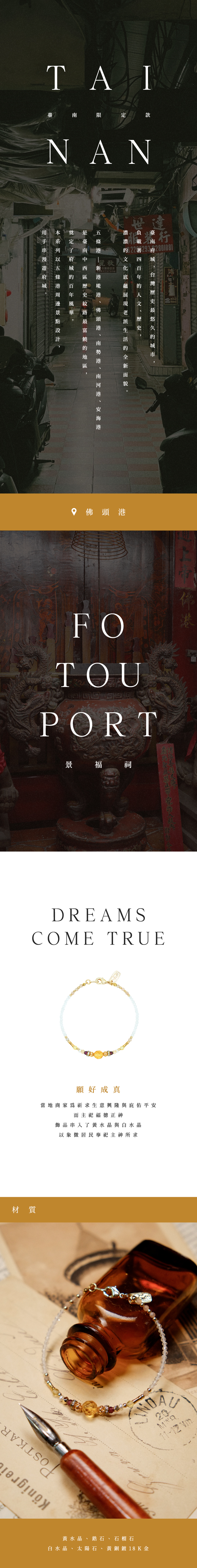 臺南府城,臺灣歷史最悠久的城市,負載著400年的人文、歷史,濃濃的文化底蘊展現老派生活的全新面貌。本系列以五條港周邊景點設計,用手串慢遊府城。