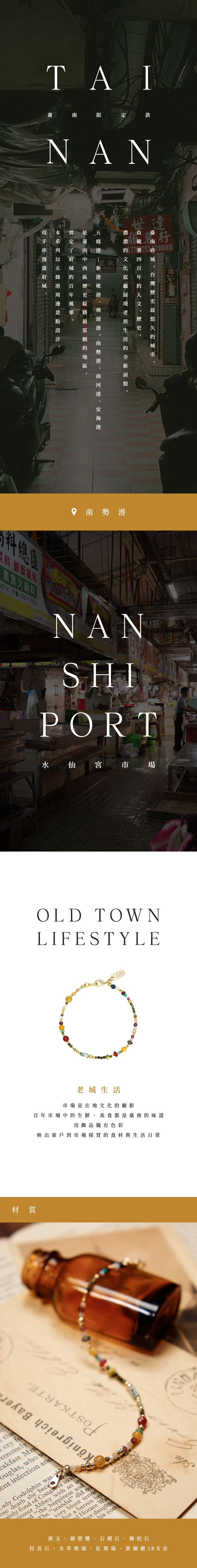 臺南府城,臺灣歷史最悠久的城市,負載著400年的人文、歷史,濃濃的文化底蘊展現老派生活的全新面貌。本系列以五條港周邊景點設計,用手串慢遊府城。