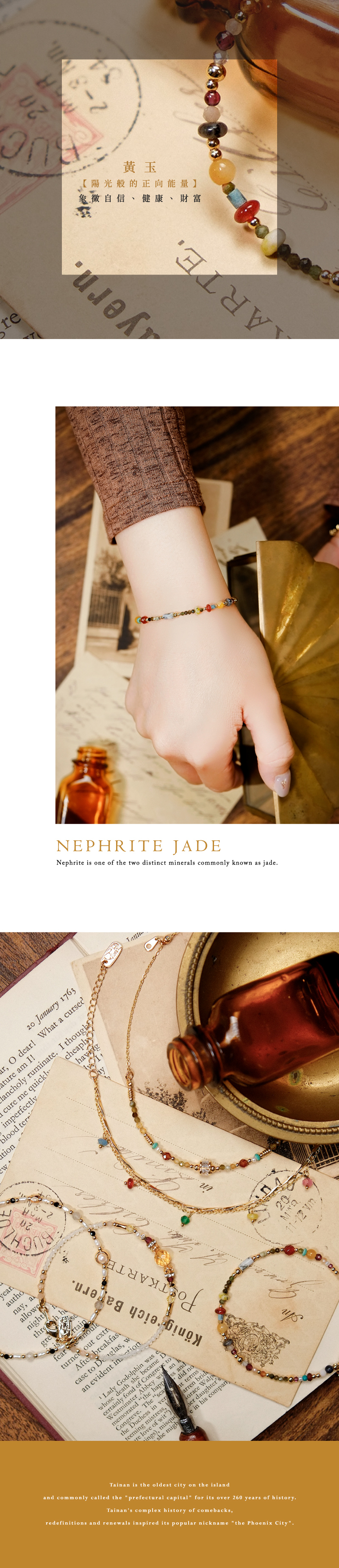 黃玉、綠碧璽、石榴石、綠松石、拉長石、水草瑪瑙、紅瑪瑙、黃銅鍍18K金