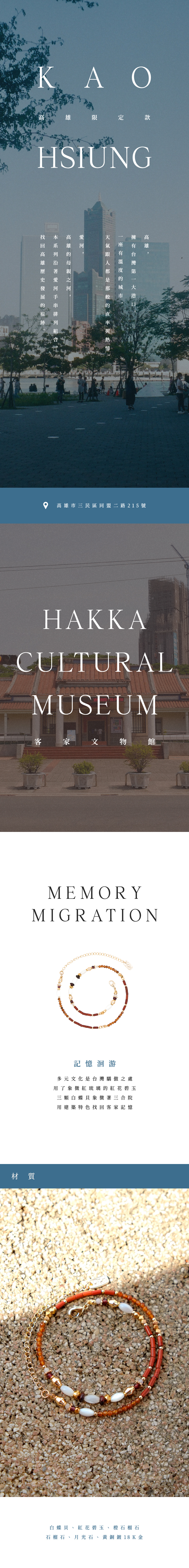 多元文化是臺灣驕傲之處,用了象徵紅琉璃的紅花碧玉,三顆蝶貝象徵著三合院,用建築特色找回客家記憶。