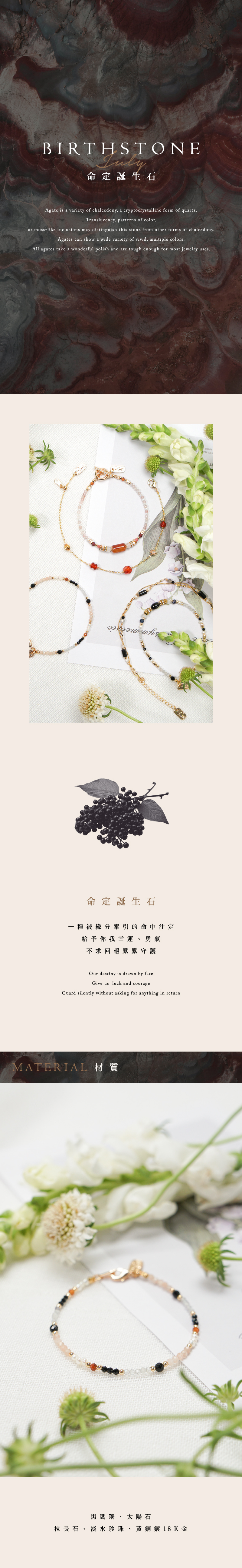 太陽石、黑瑪瑙、拉長石、尖晶石、橙石榴石、淡水珍珠、黃銅鍍18K金