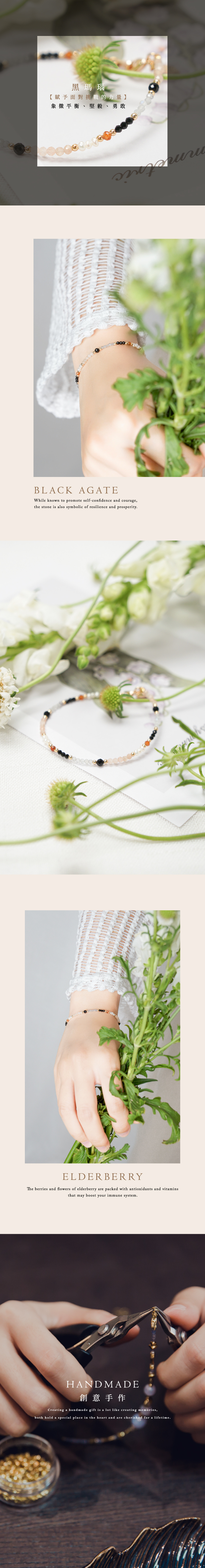 黑瑪瑙 Black Agate:象徵堅毅,使人客觀超然,不至於在複雜的環境中迷失方向,且增加信心。