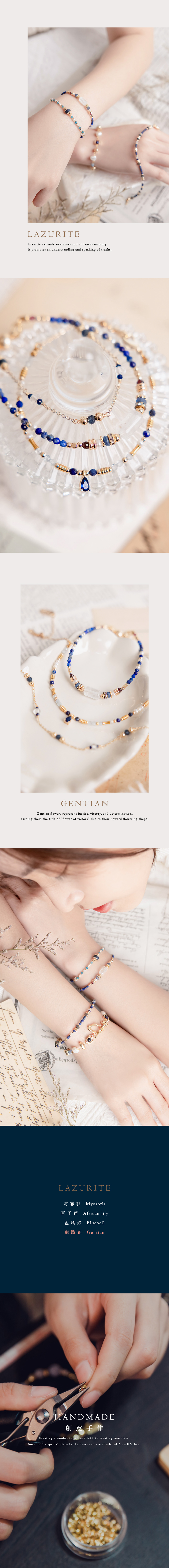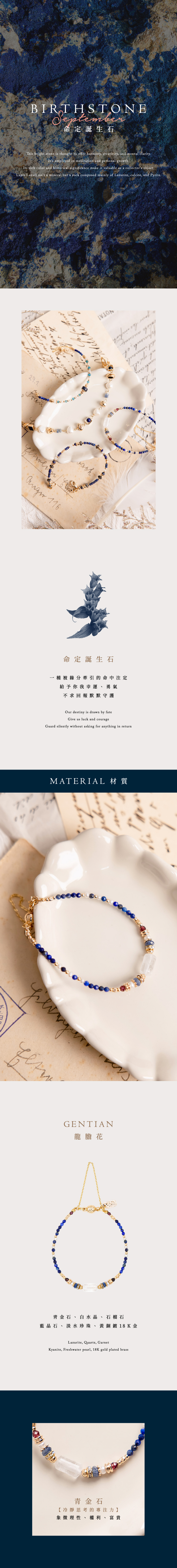 白水晶、青金石、石榴石、藍晶石、淡水珍珠、黃銅鍍18K金