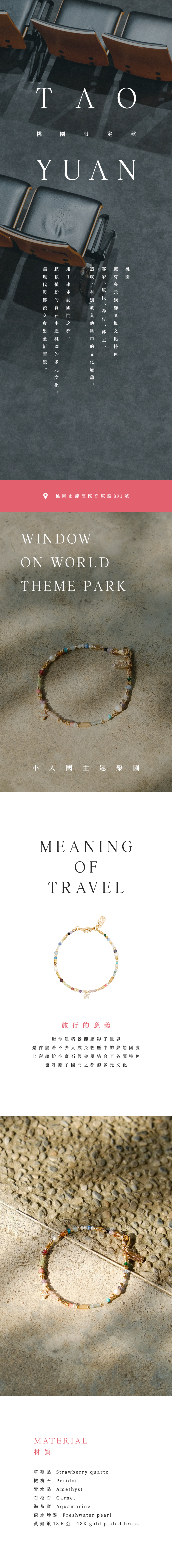 桃園,擁有多元族群匯集文化特色,用手串走訪國門之都,顆顆繽紛的寶石串進桃園的多元文化,讓現代與傳統交會出全新面貌。
