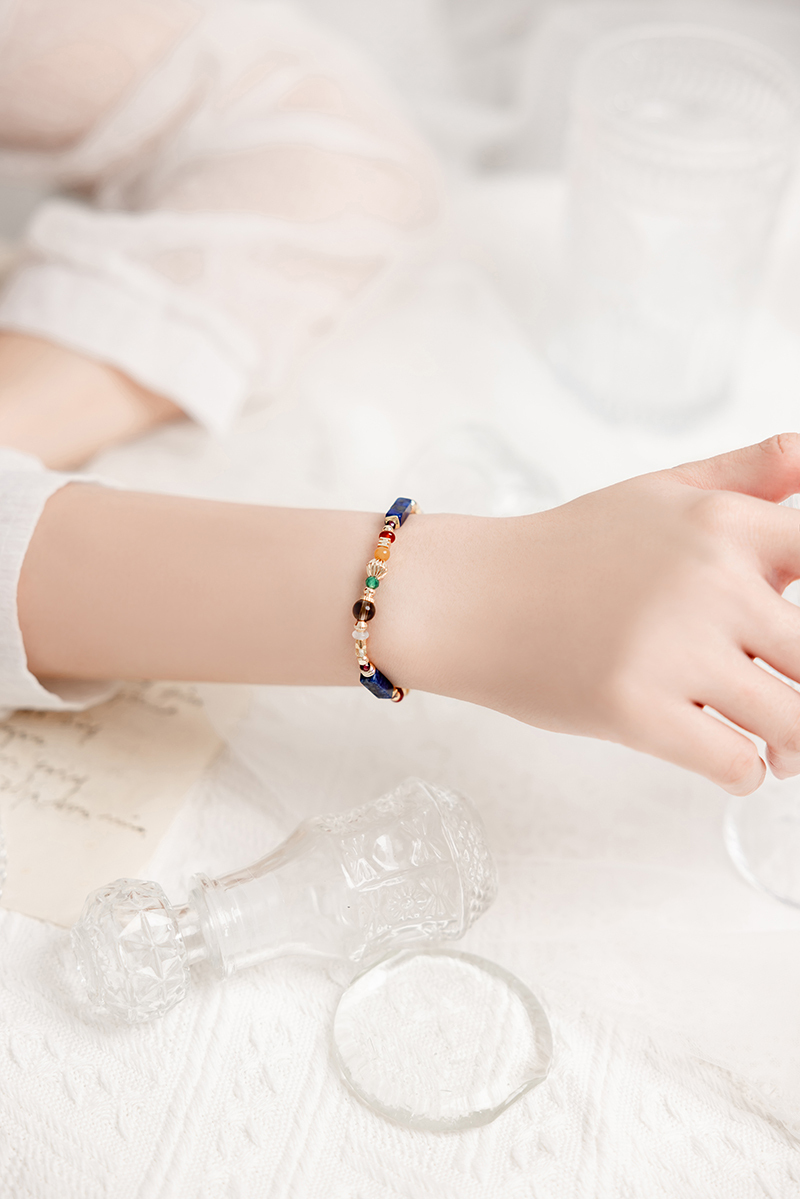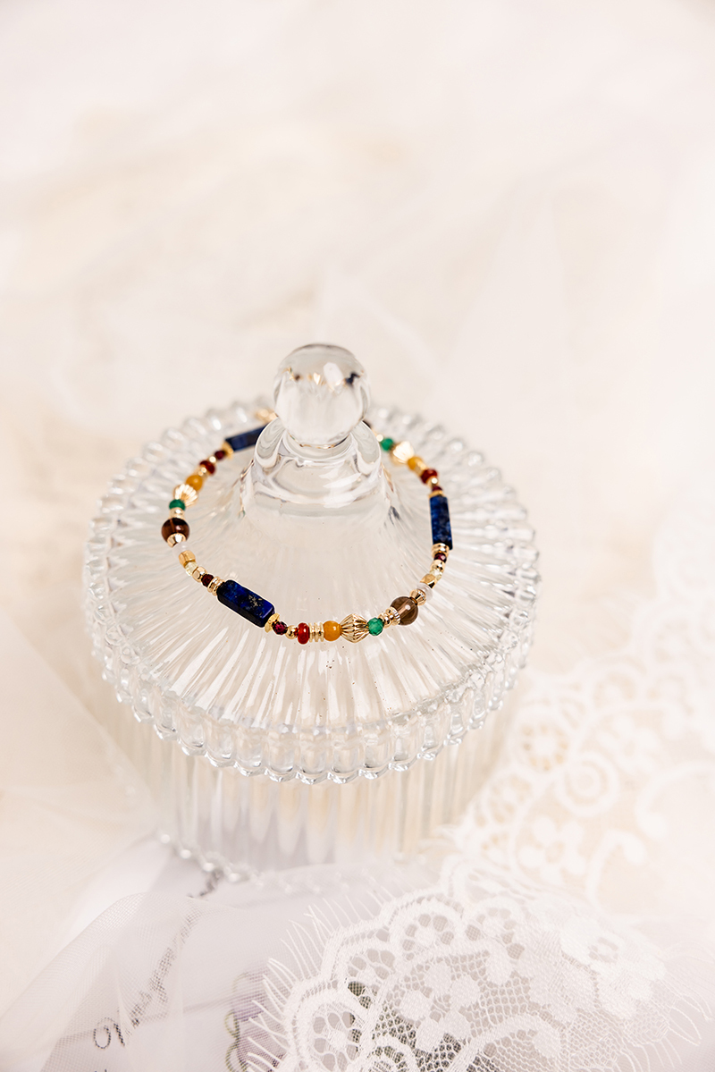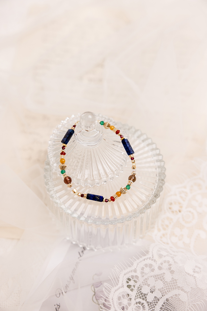 青金石、紅瑪瑙、石榴石、黃玉、綠瑪瑙、白玉、黃水晶、黃銅鍍18K金