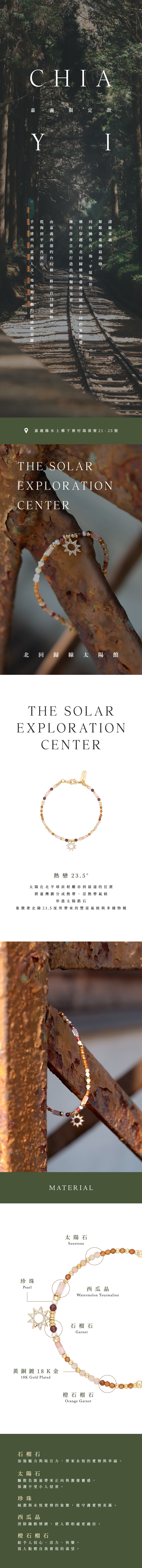 太陽在北半球直射離赤到最遠的位置,將臺灣劃分成熱帶、亞熱帶氣候,串進太陽鋯石象徵著北緯23.5度所帶來的豐富氣候與多樣物種。