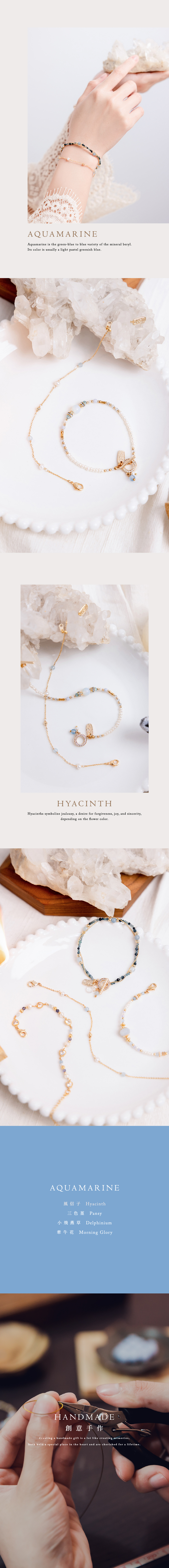 海藍寶 Aquamarine:象徵「沉著」與「勇敢」,可增強表達能與說服力,正確的表達自我。