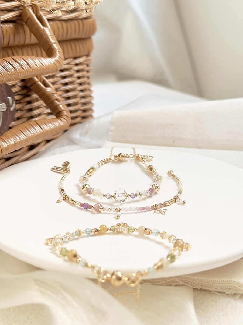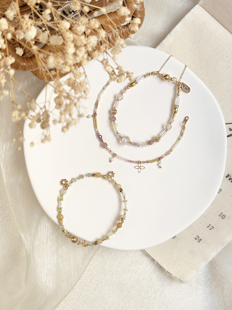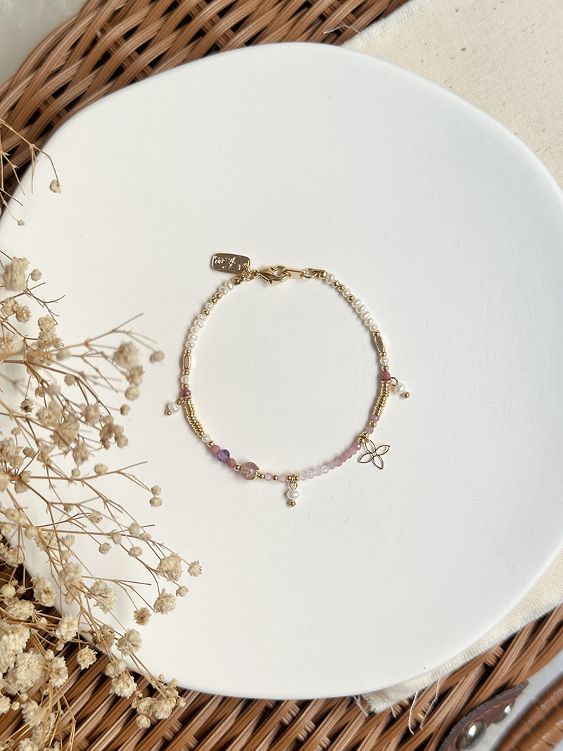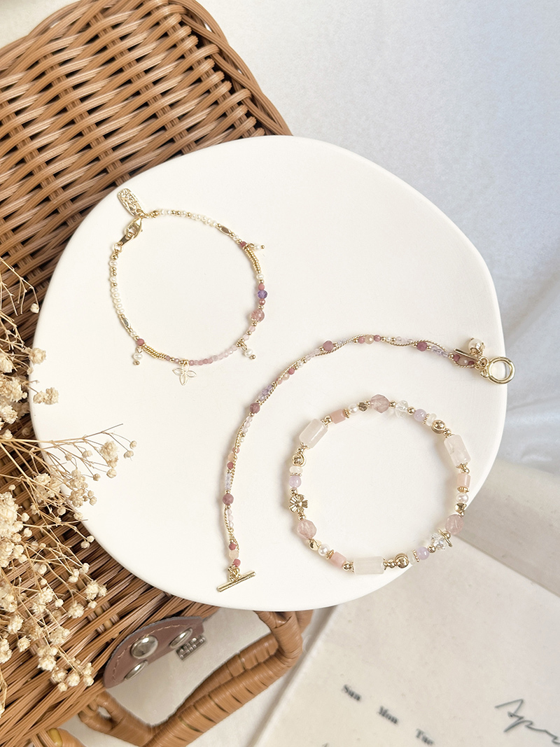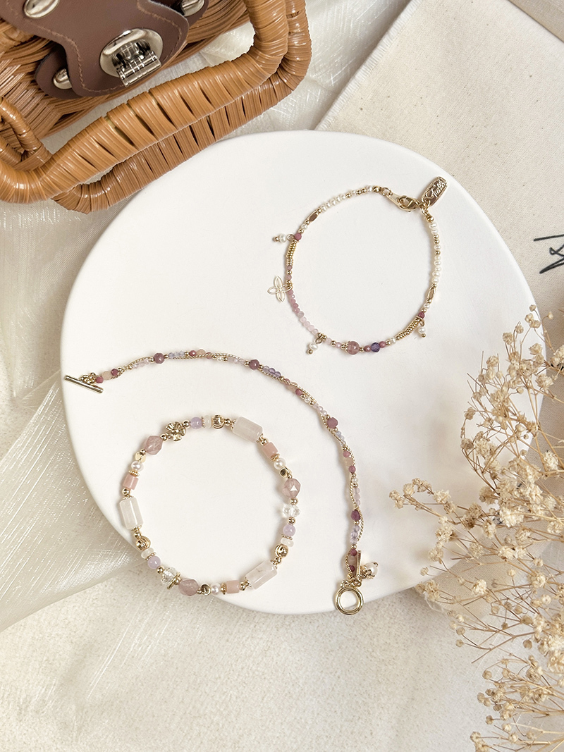 草莓晶、淡水珍珠、粉貓眼石、紫水晶、紅紋石、黃銅鍍18K金