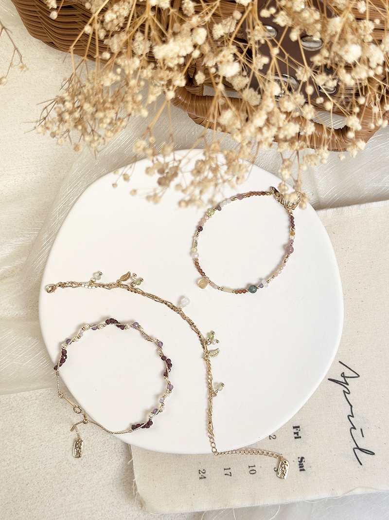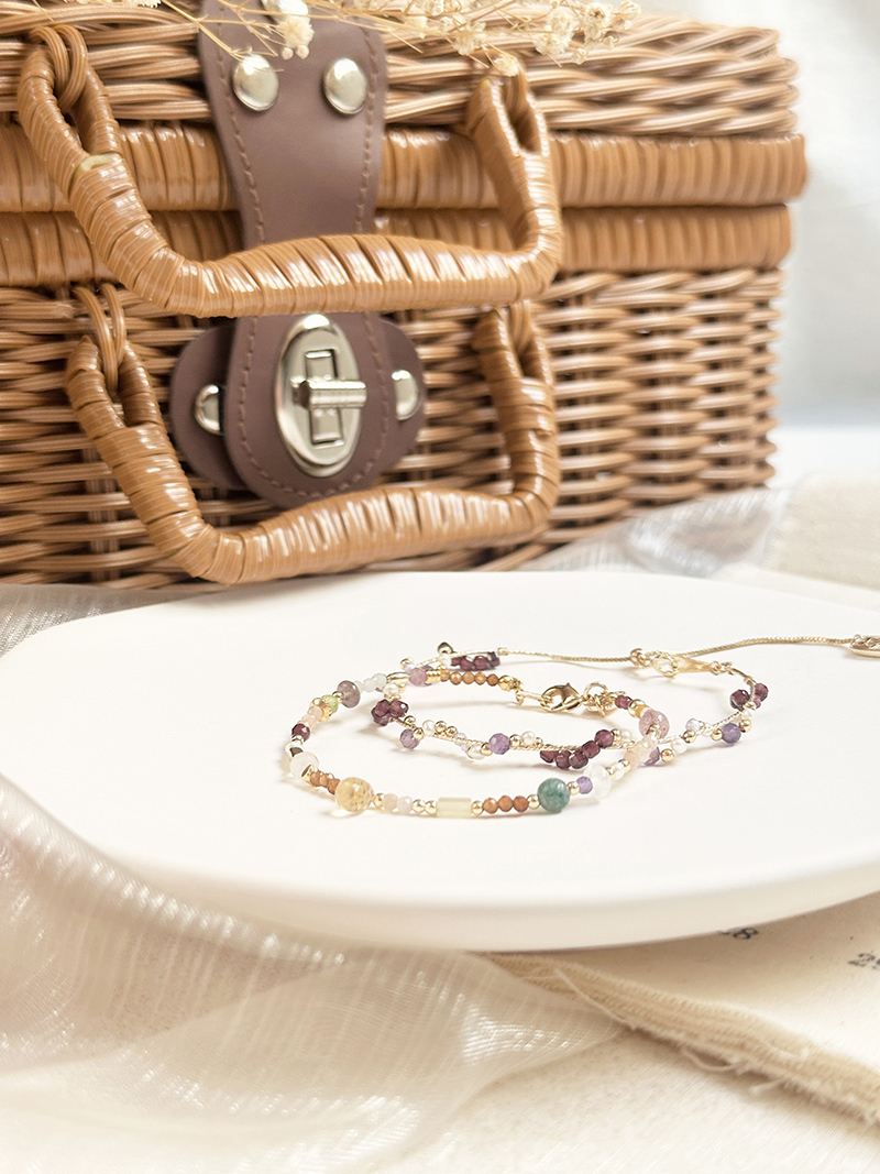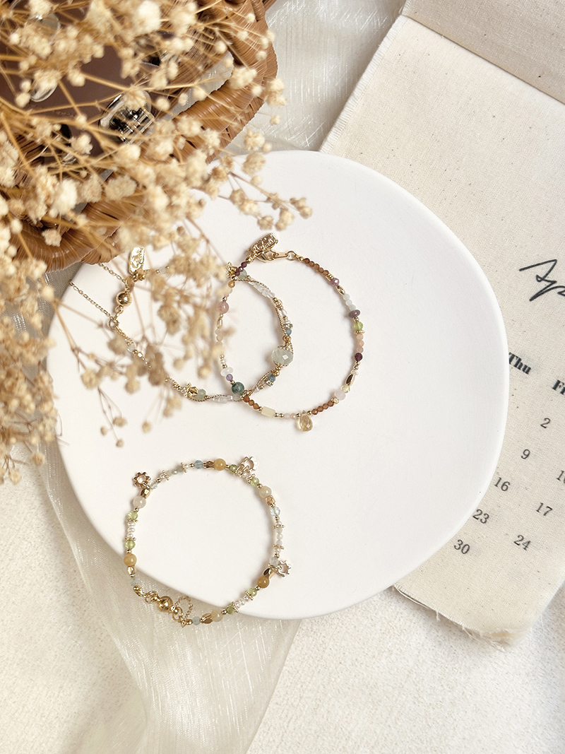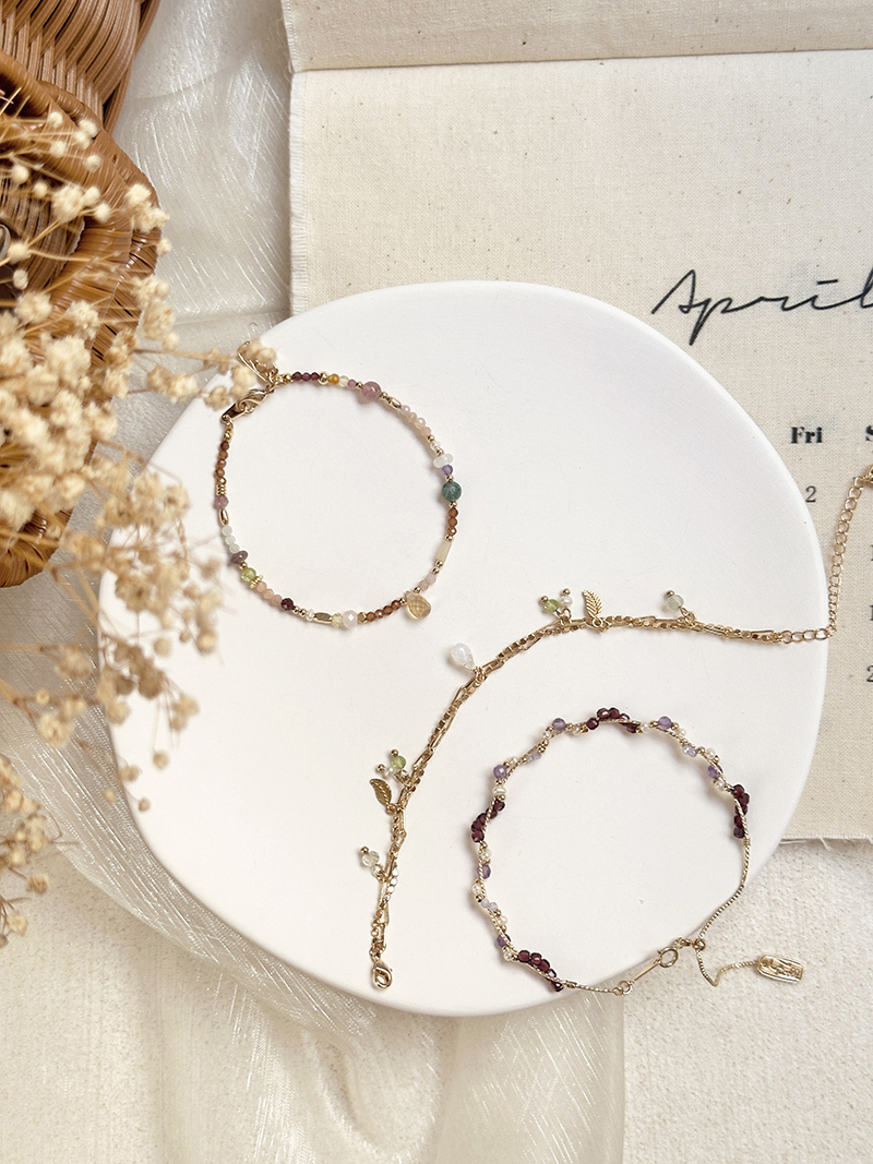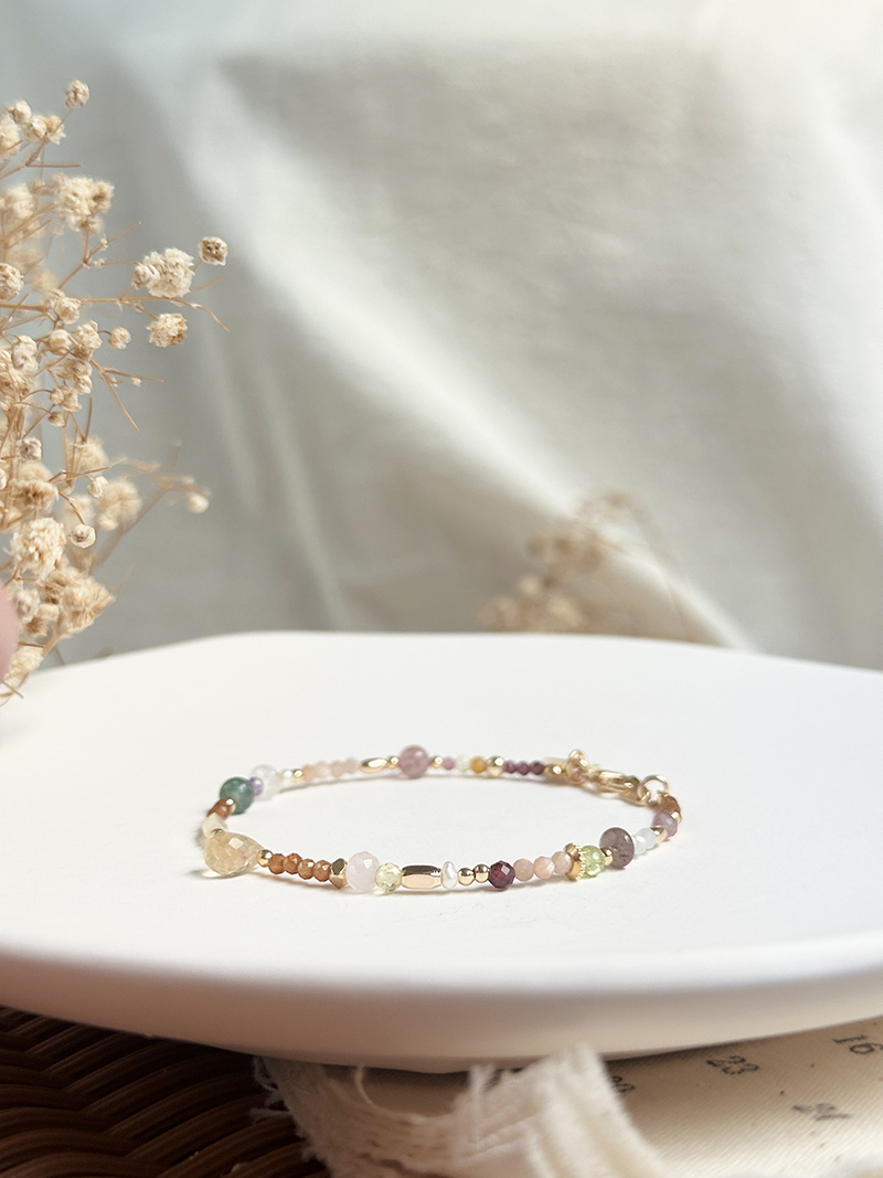 黃水晶、石榴石、粉晶、黃水晶、淡水珍珠、橄欖石、粉碧璽、草莓晶、水草瑪瑙、太陽石、黃銅鍍18K金