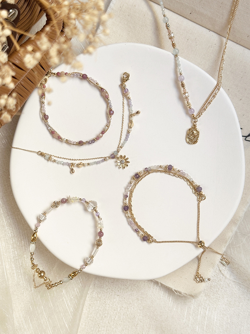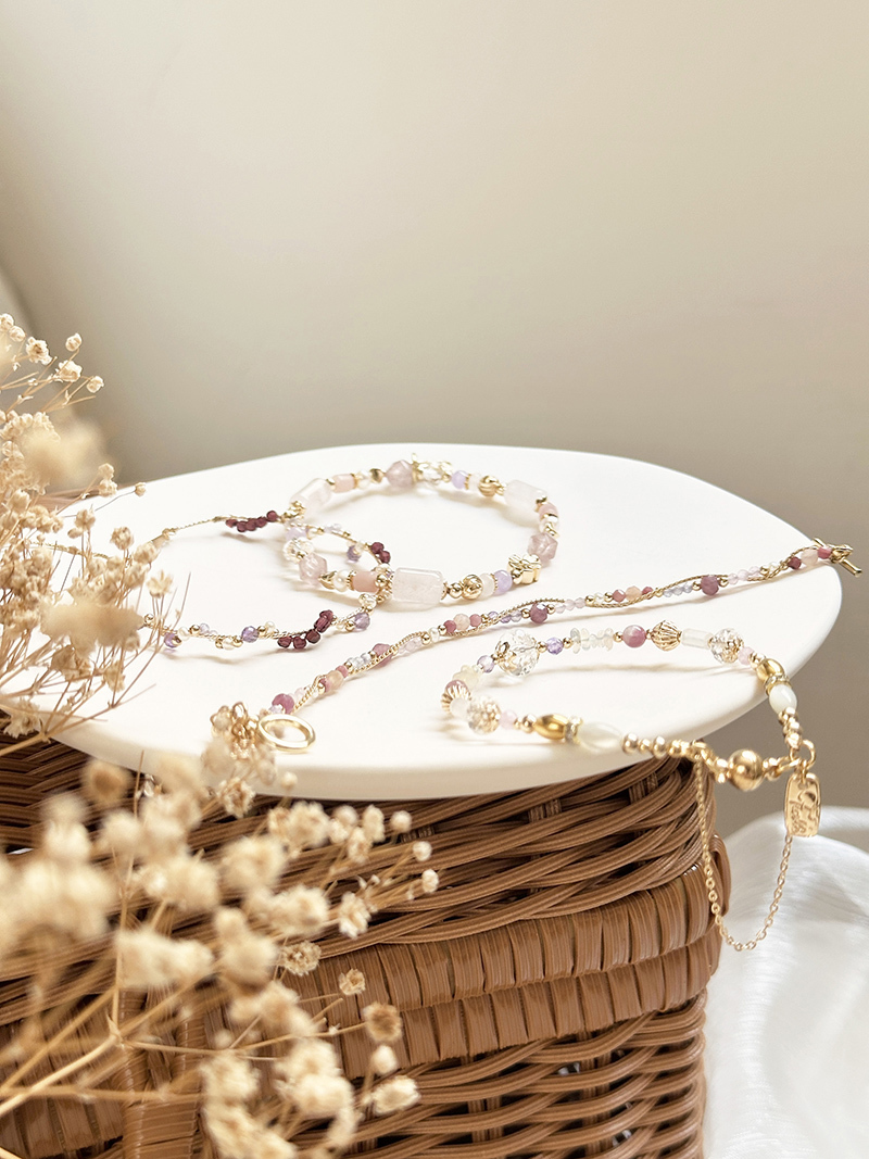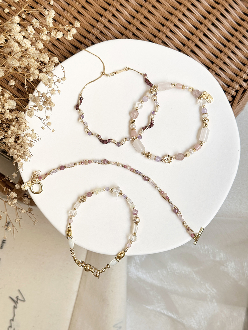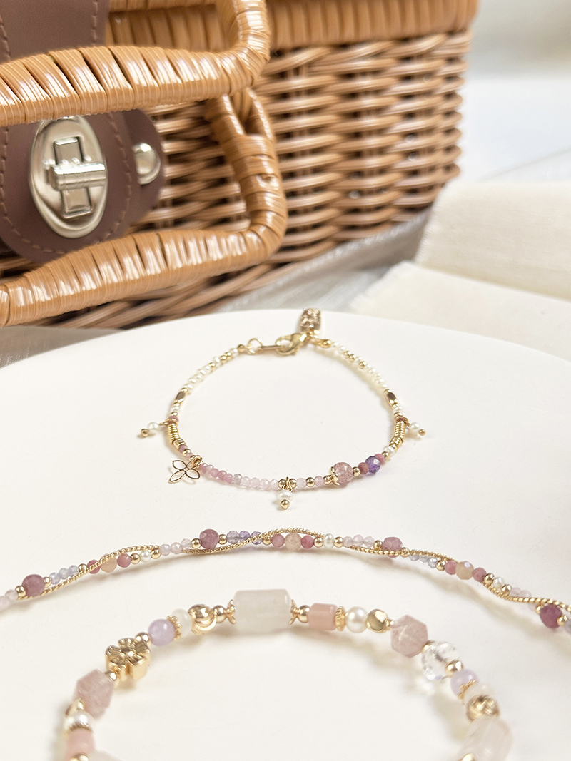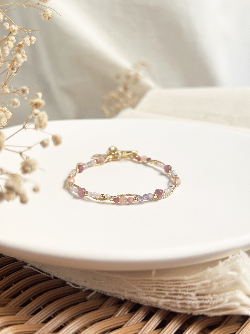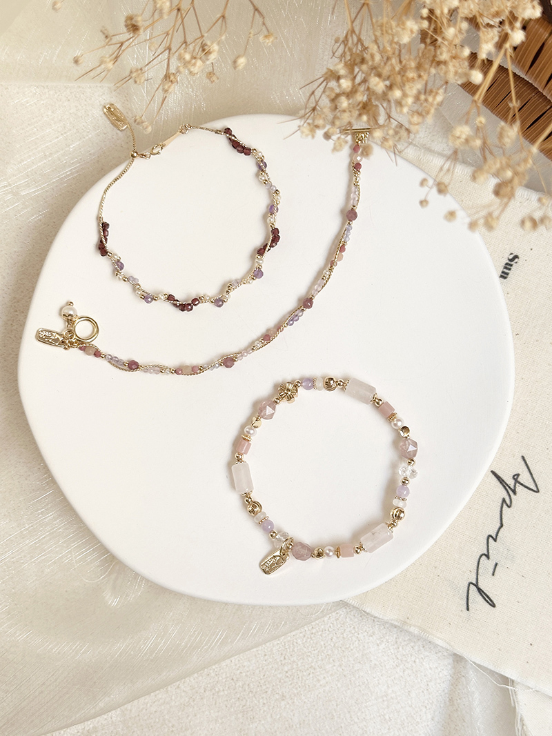 粉碧璽、紅紋石、紫水晶、太陽石、紫鋯石、淡水珍珠、粉貓眼石、黃銅鍍18K金