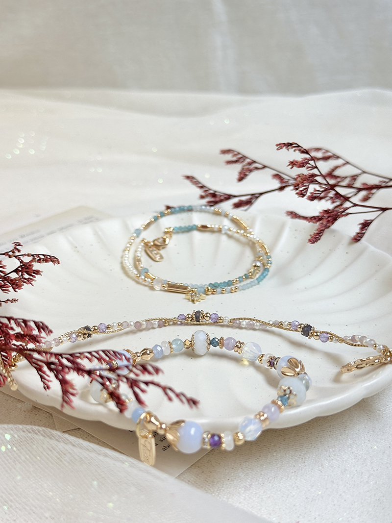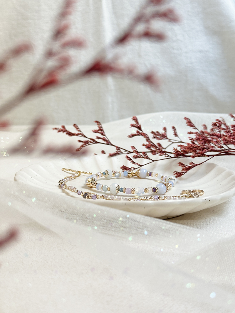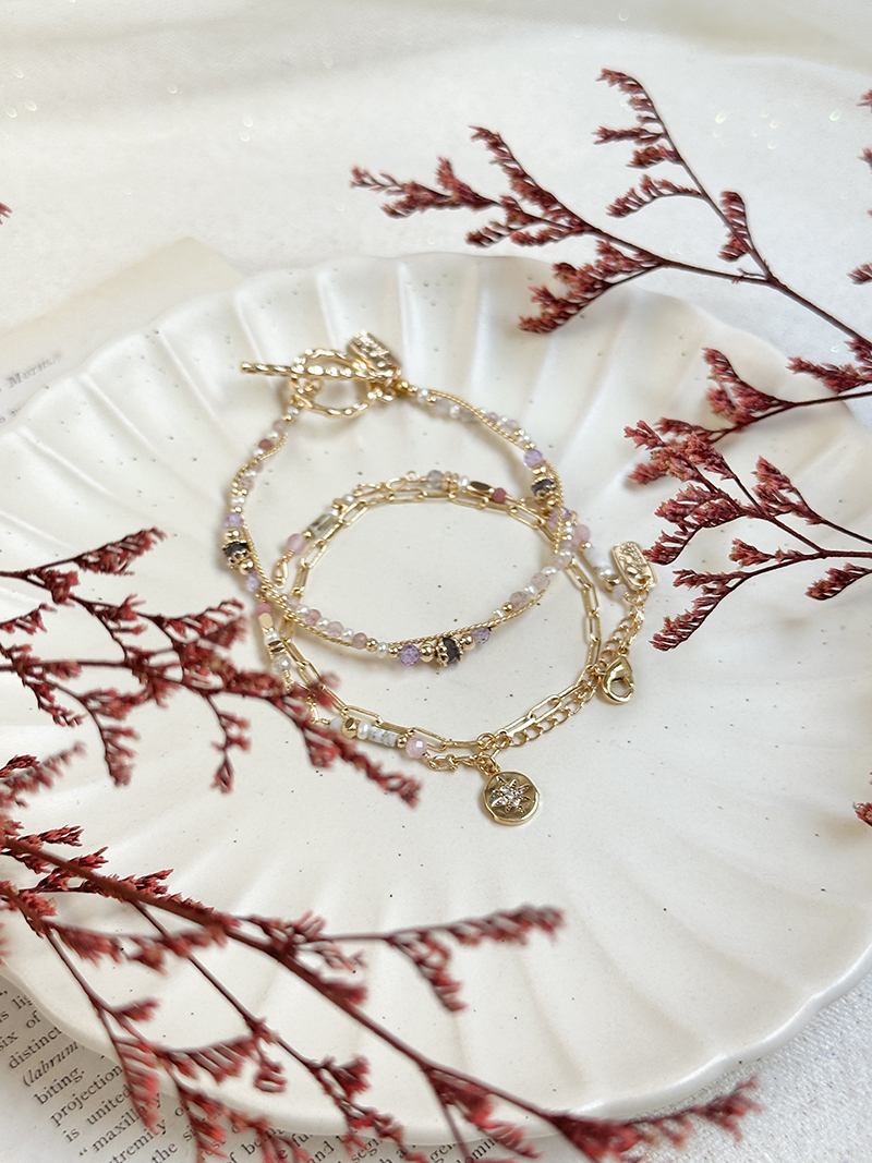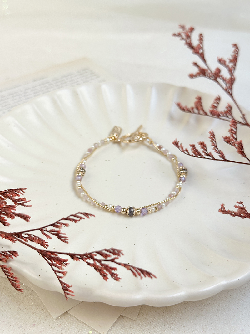 堇青石、紫水晶、淡水珍珠、草莓晶、黃銅鍍18K金