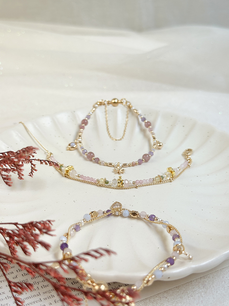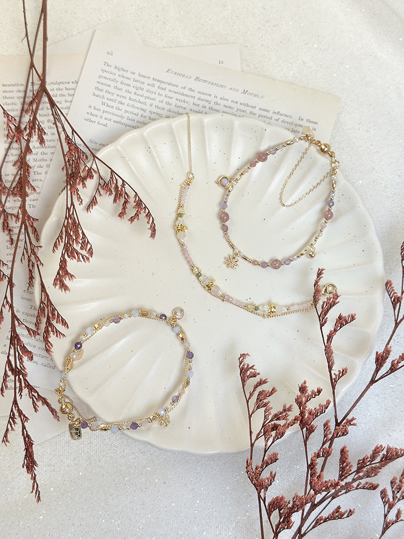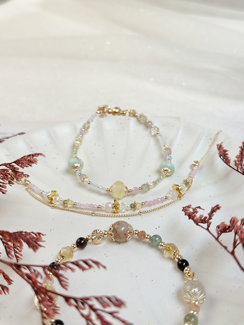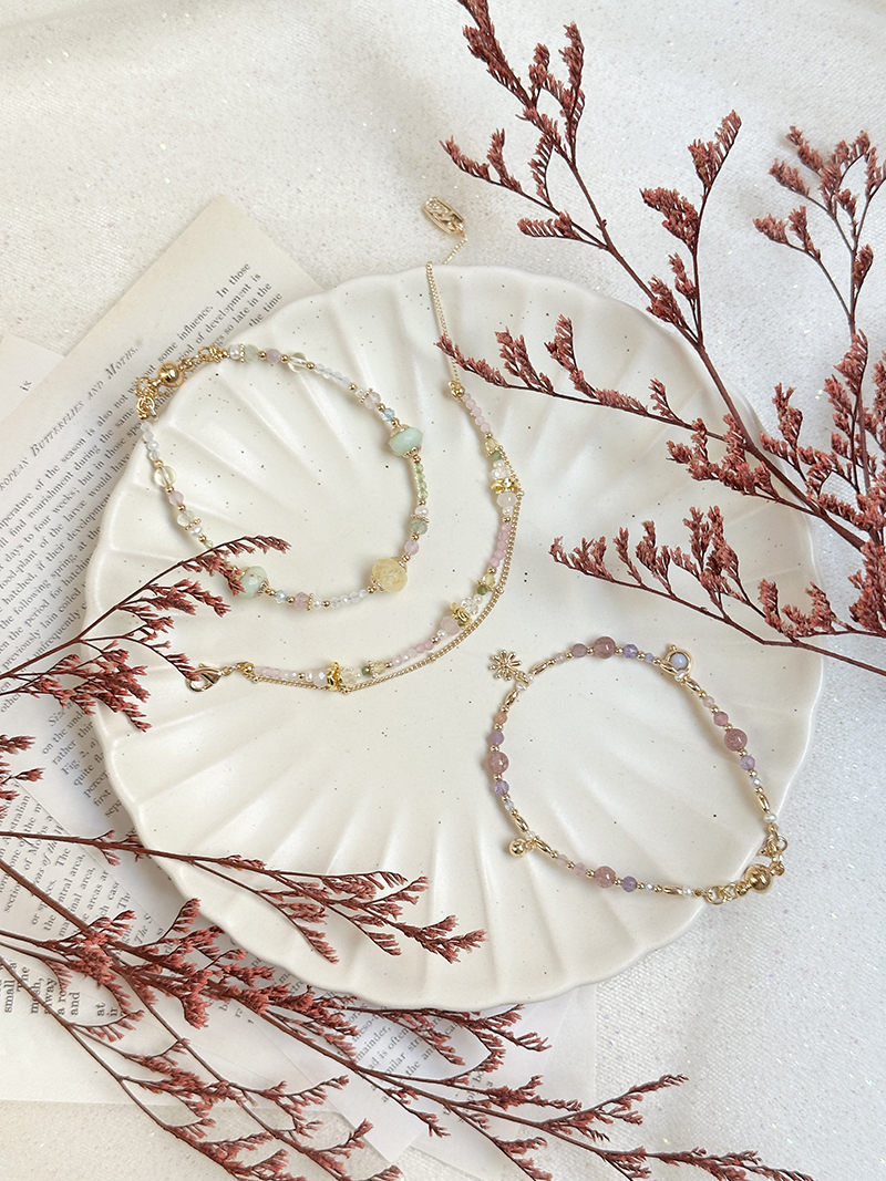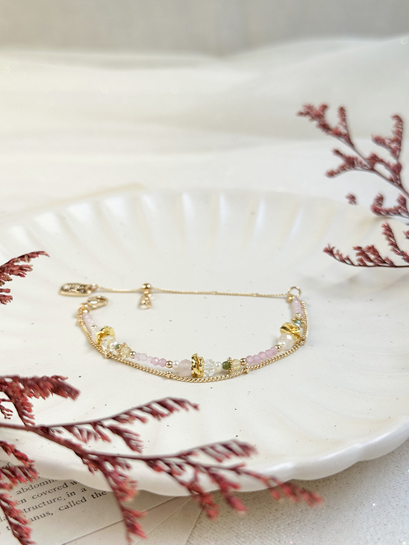 粉晶、白水晶、綠碧璽、粉貓眼石、淡水珍珠、黃水晶、黃銅鍍18K金