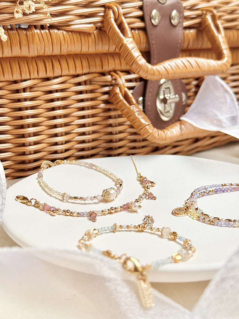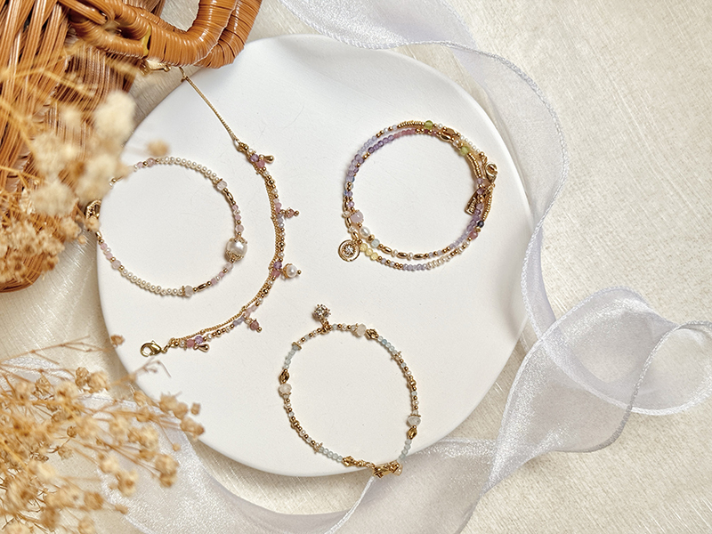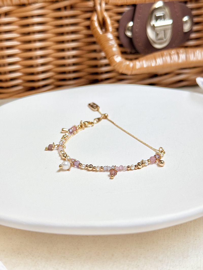 珍珠、草莓晶、紫水晶、紫鋯石、粉碧璽、黃銅鍍18K金