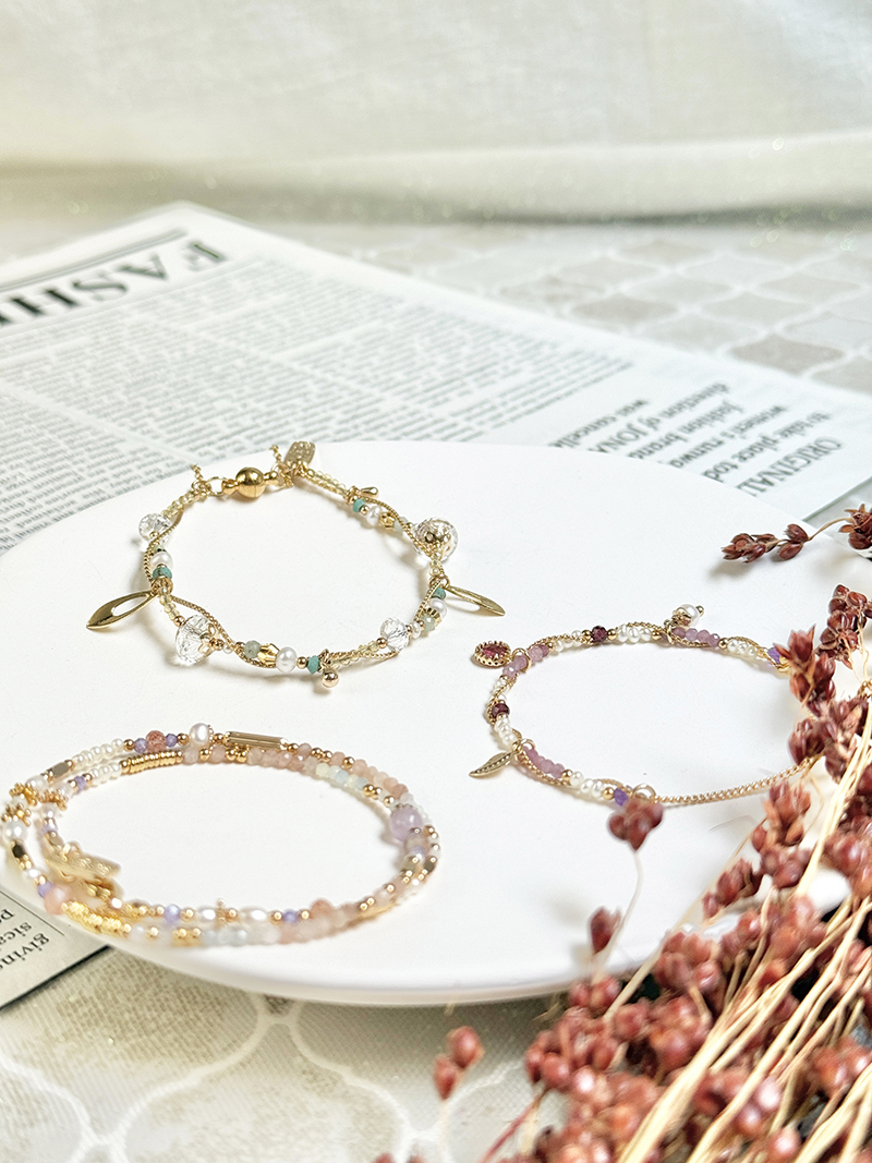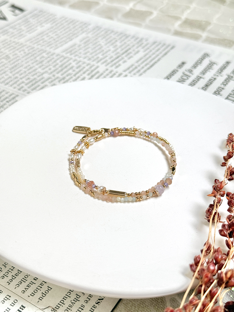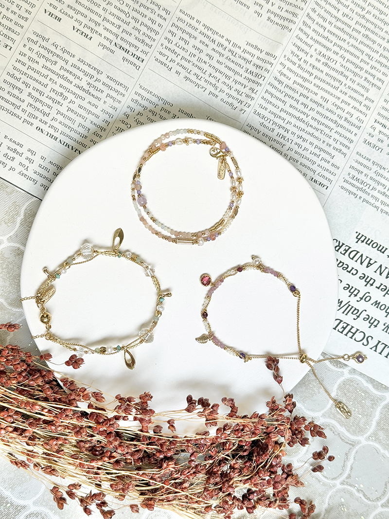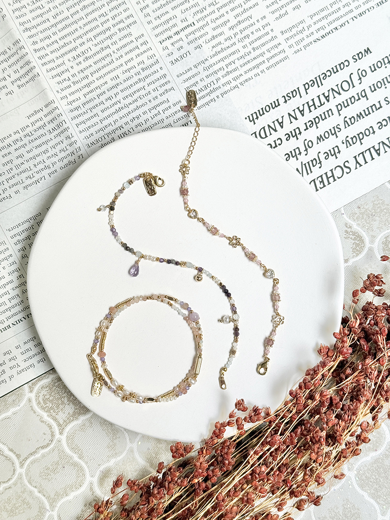 紫水晶、太陽石、摩根石、淡水珍珠、金草莓晶、黃銅鍍18K金