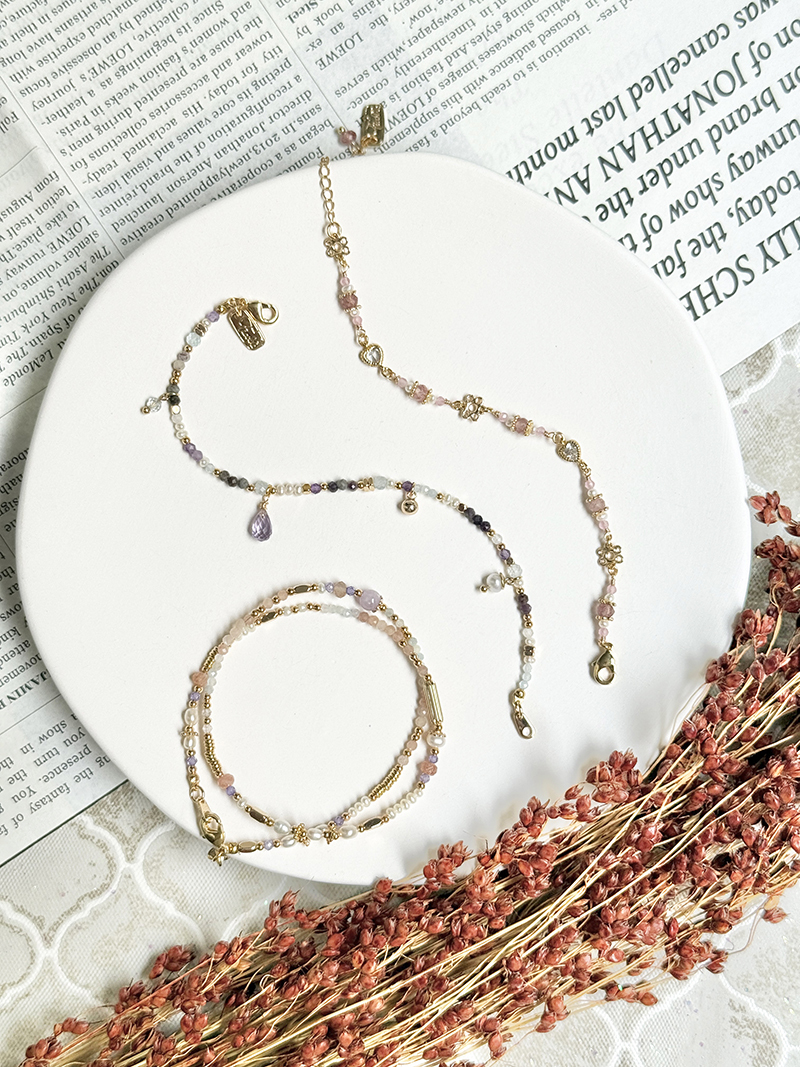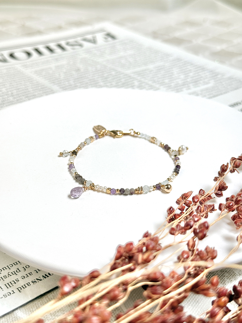 紫水晶、漸層舒俱徠石、海藍寶、淡水珍珠、黃銅鍍18K金