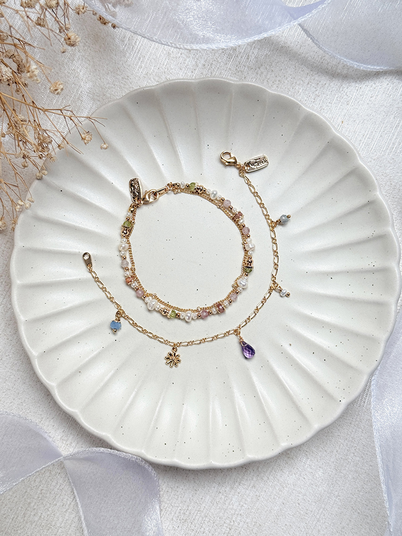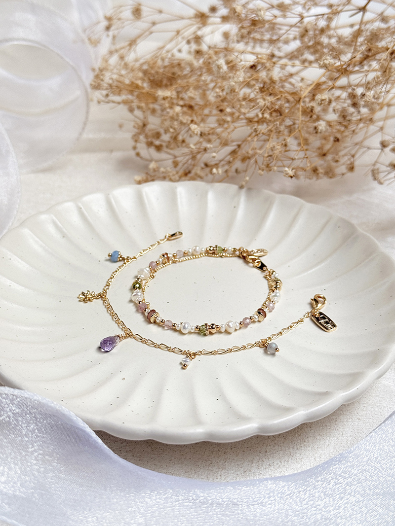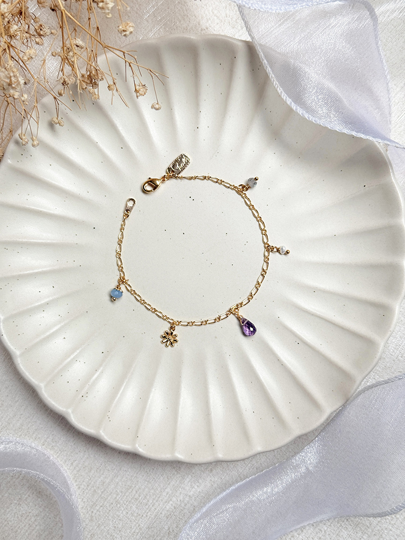 紫水晶、拉長石、淡水珍珠、海藍玉髓、黃銅鍍18K金