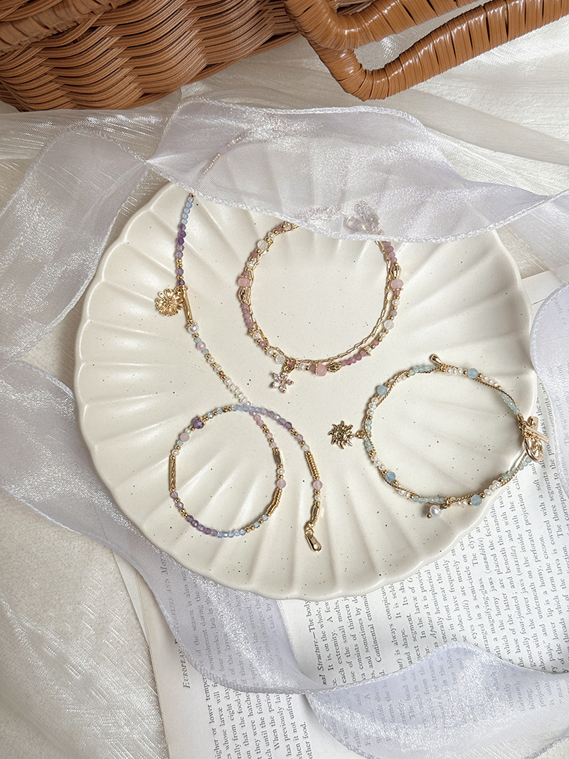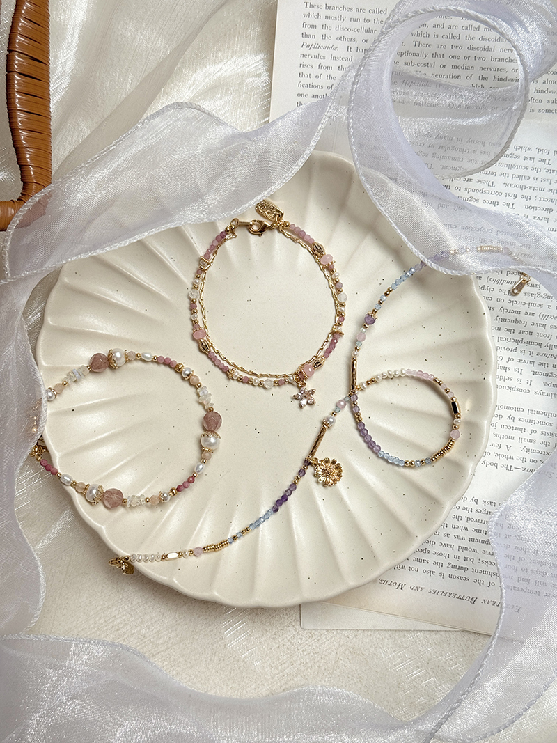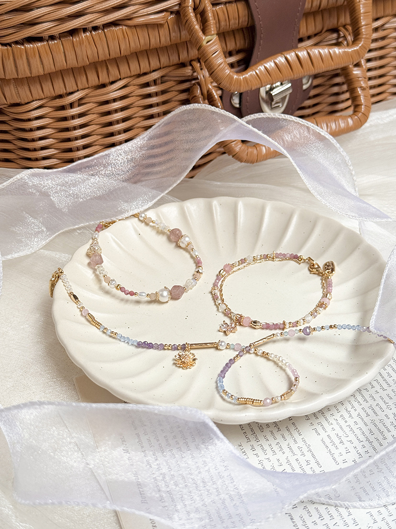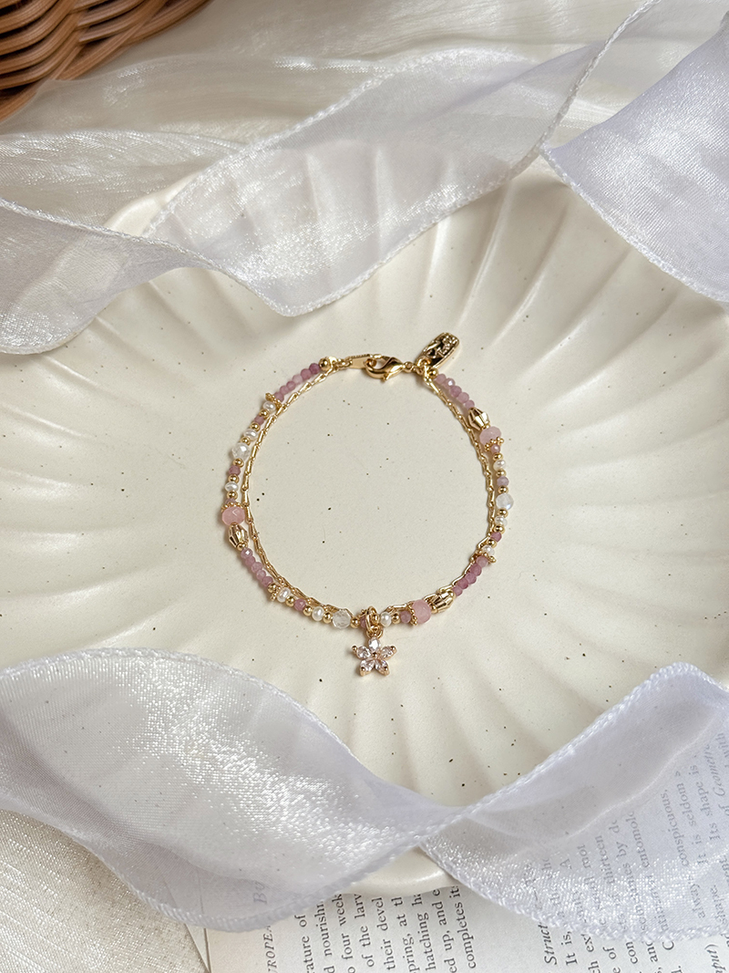 粉晶、粉碧璽、淡水珍珠、月光石、鋯石、黃銅鍍18K金