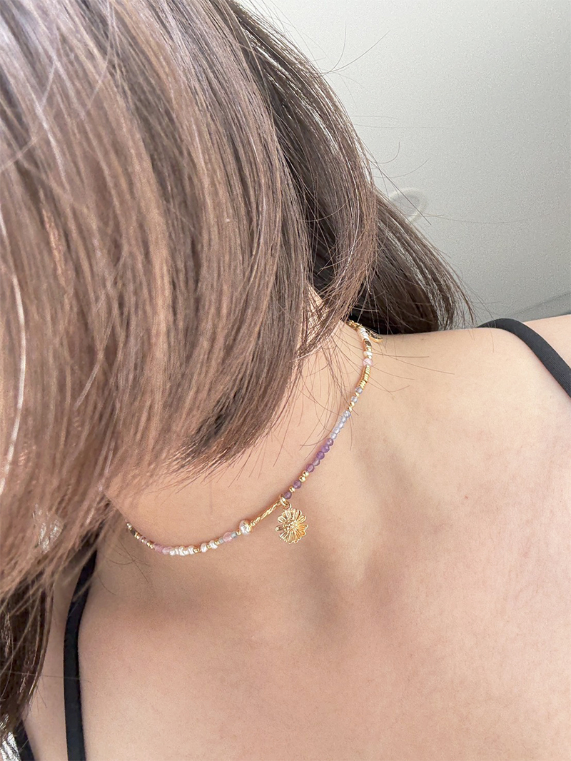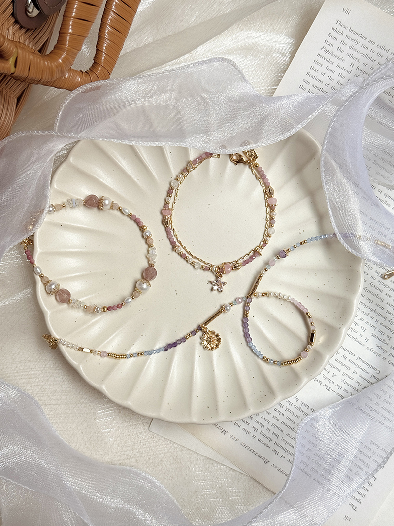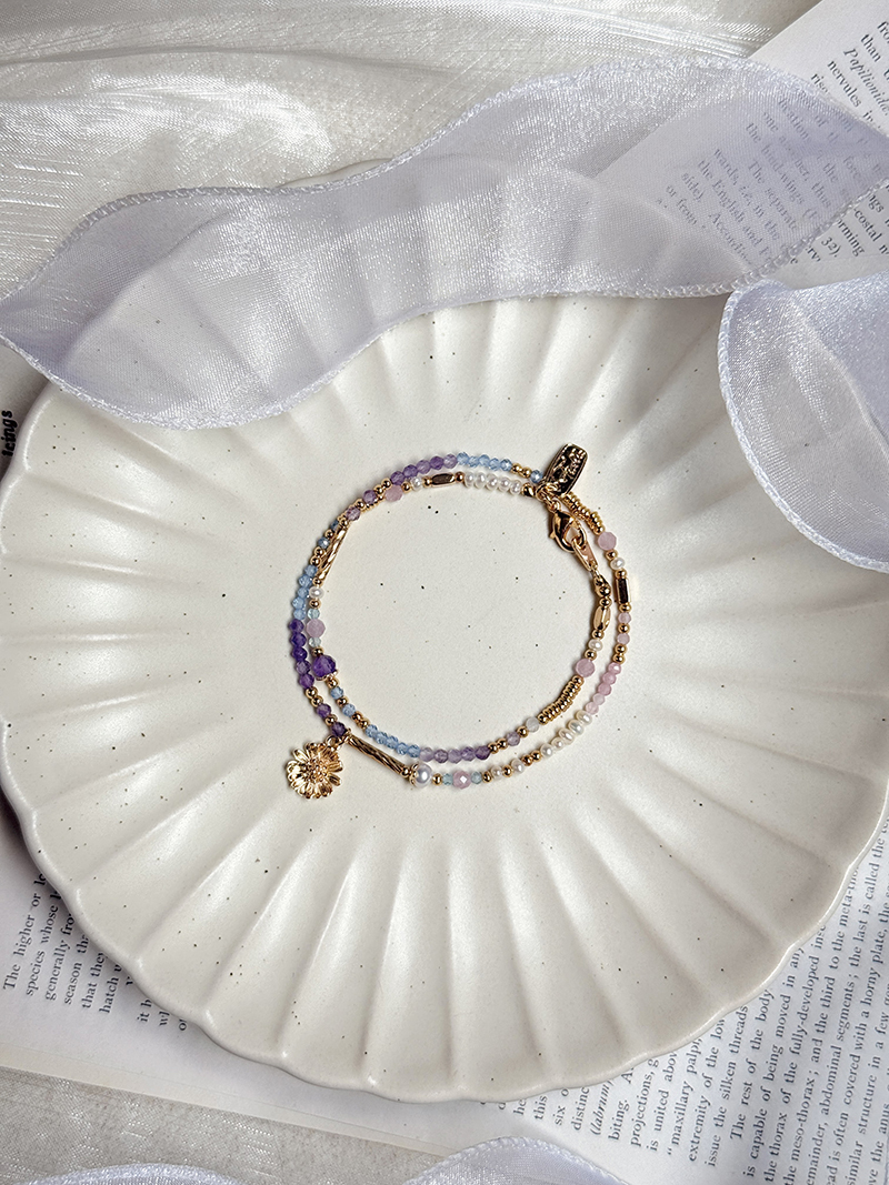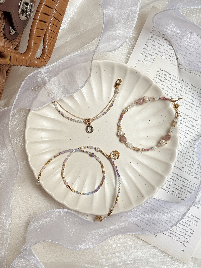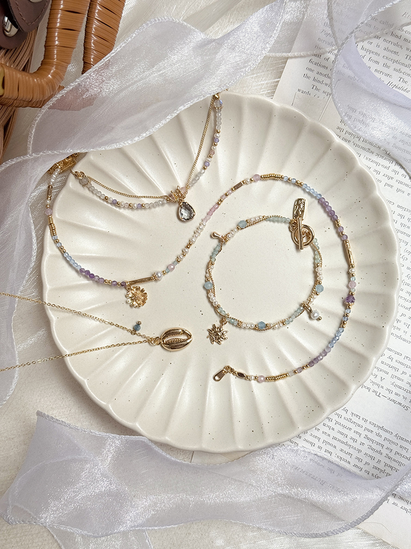 紫水晶、托帕石、粉貓眼石、磷灰石、淡水珍珠、黃銅鍍18K金