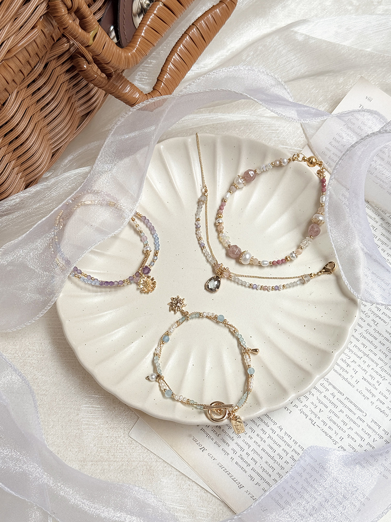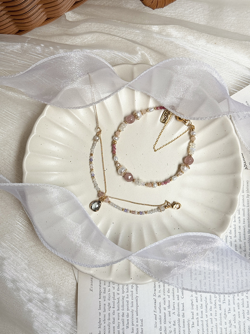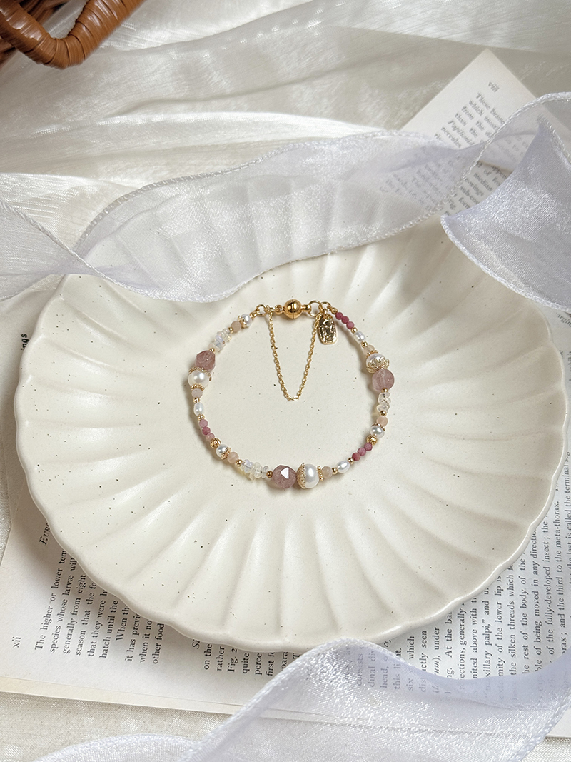 草莓晶、淡水珍珠、太陽石、紅紋石、蛋白石、黃銅鍍18K金