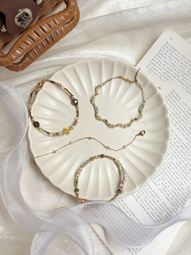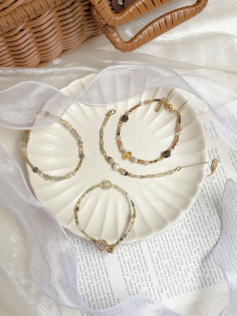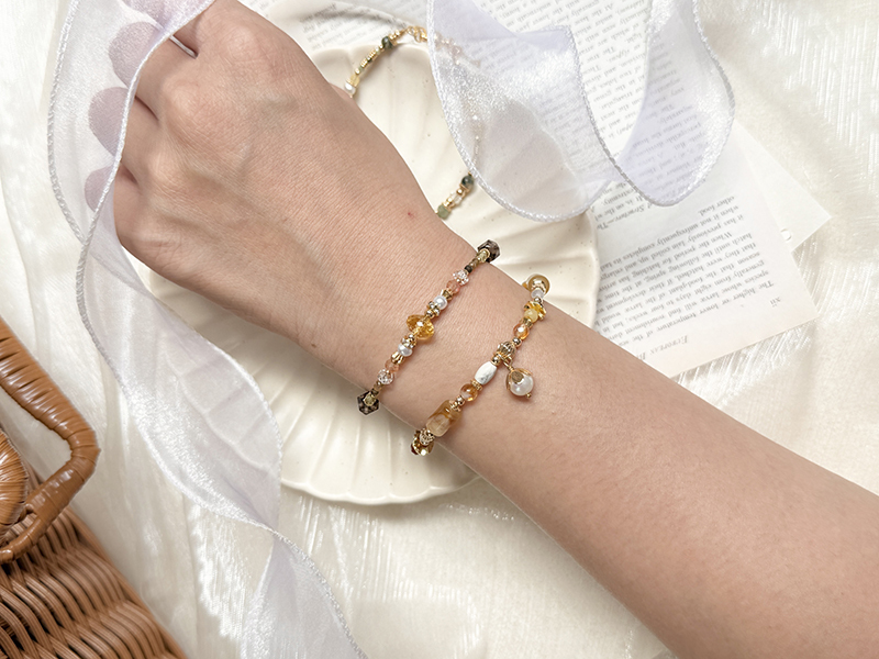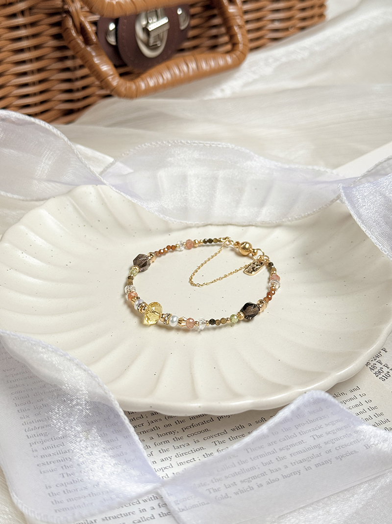 茶晶、黃水晶、金草莓晶、淡水珍珠、白水晶、黃碧璽、橄欖石、石榴石、橙石榴石、黃銅鍍18K金