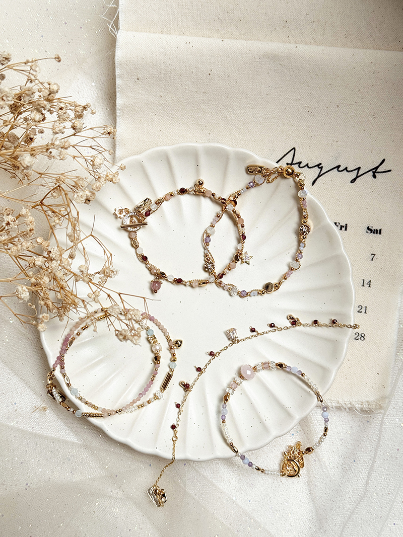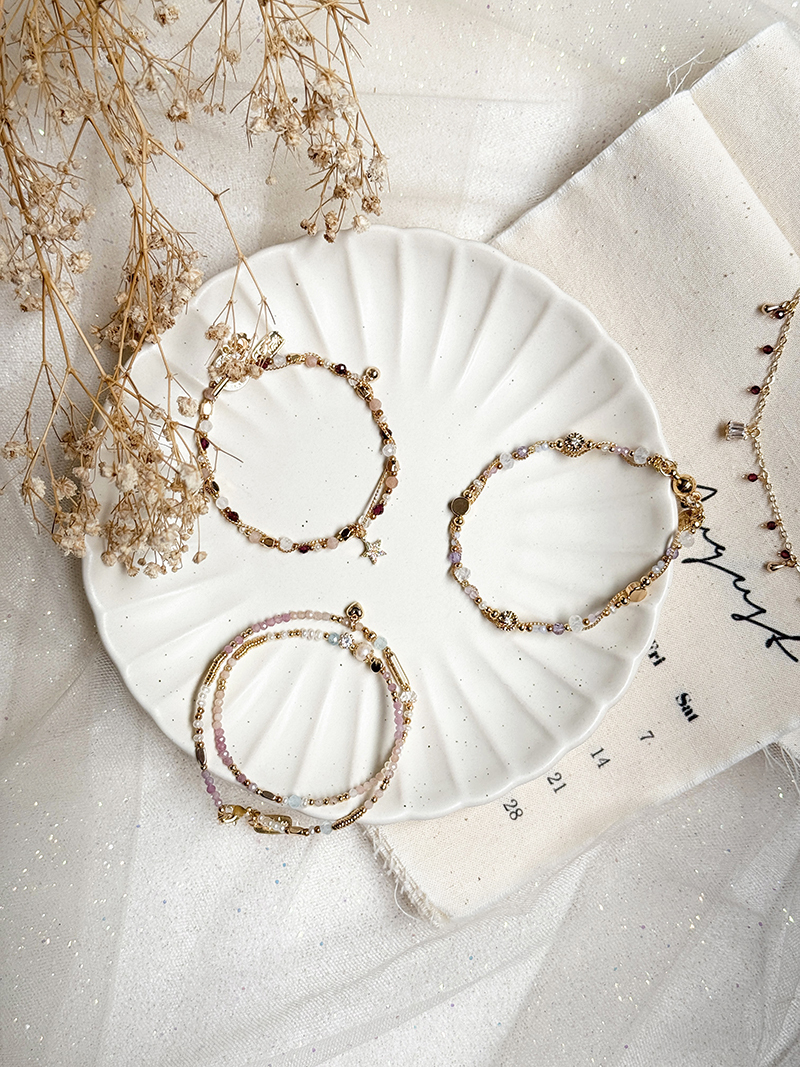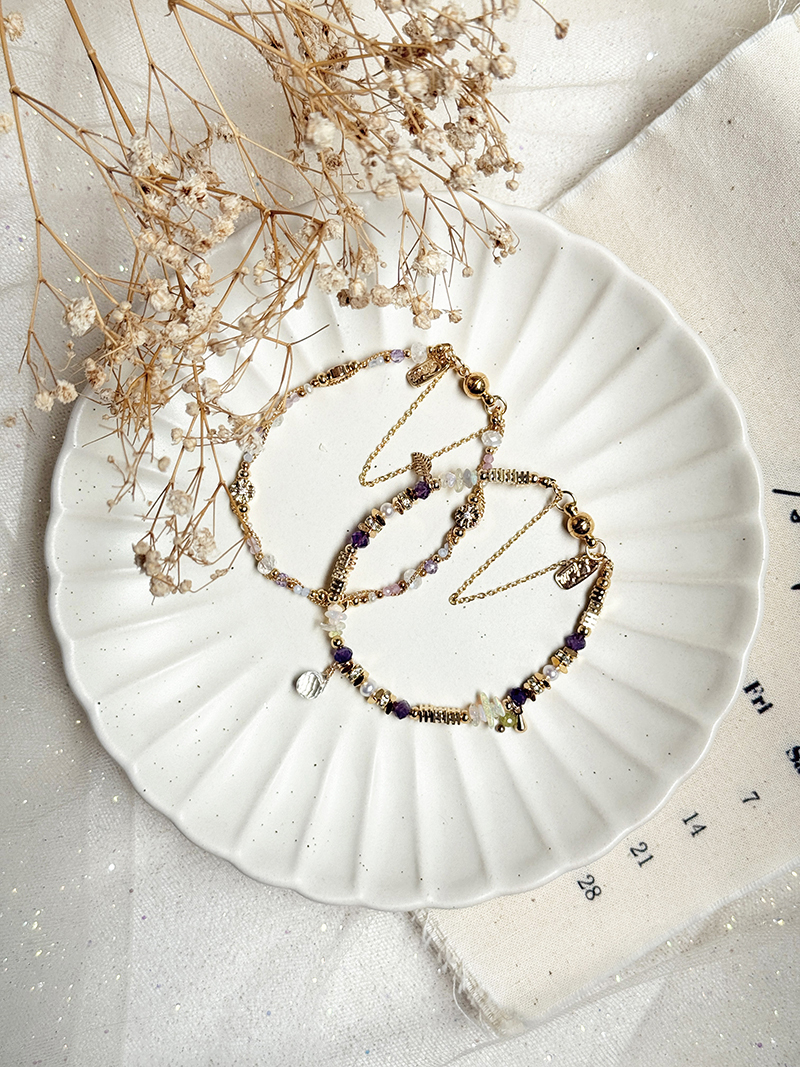 月光石、紫水晶、藍紋瑪瑙、淡水珍珠、粉碧璽、黃銅鍍18K金