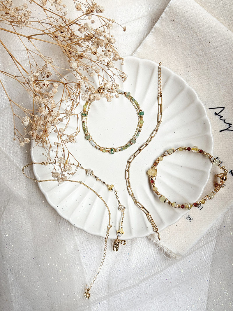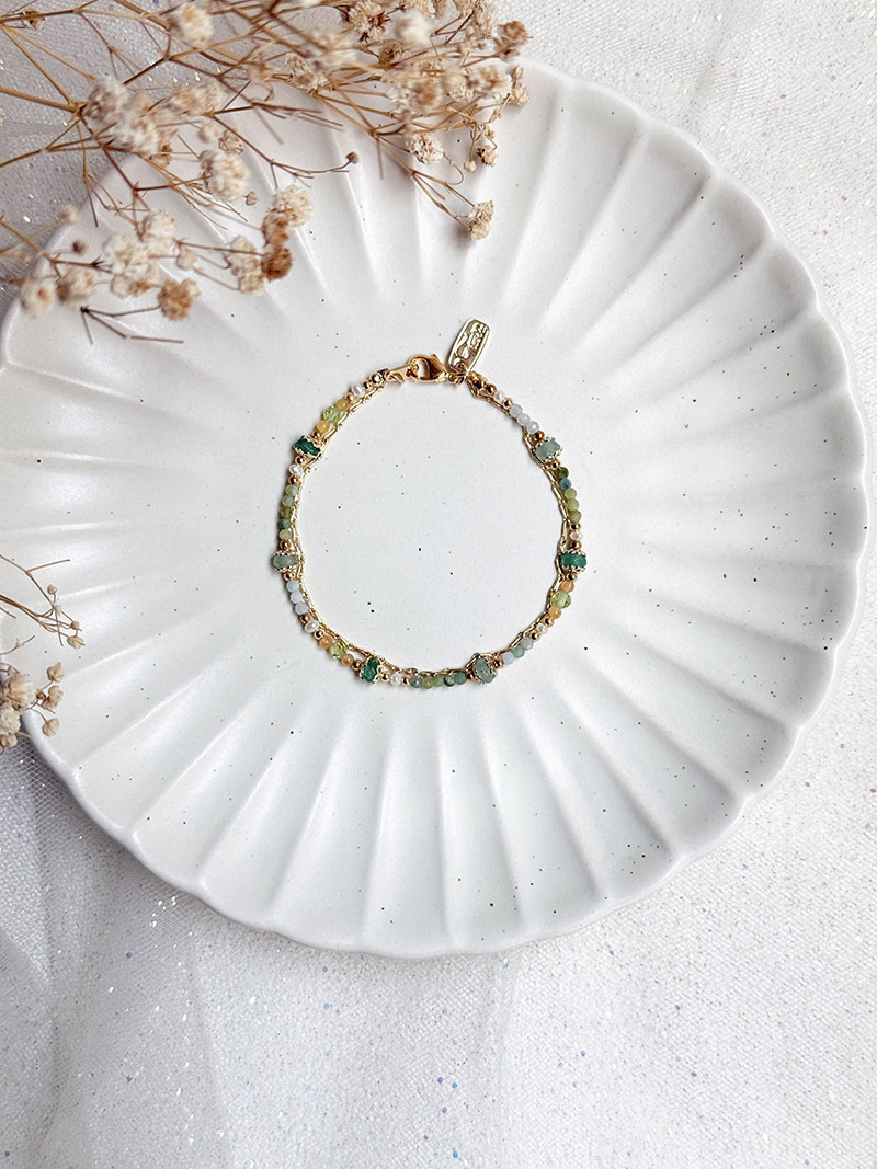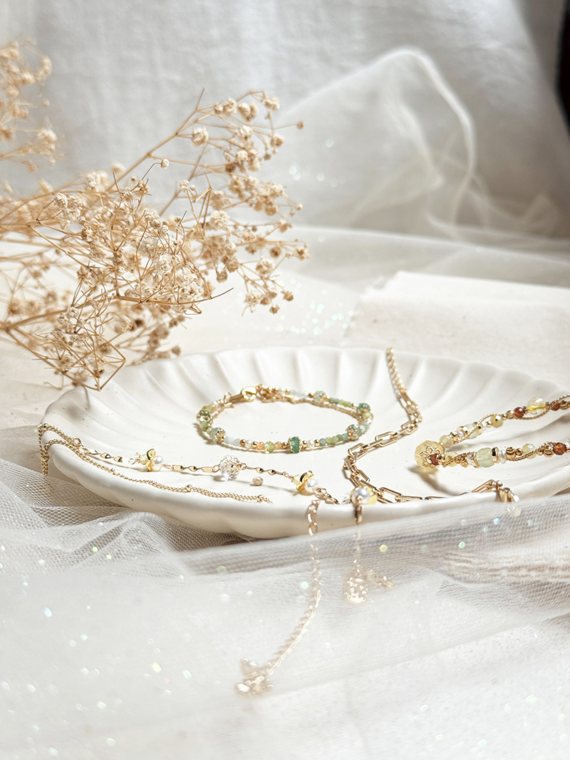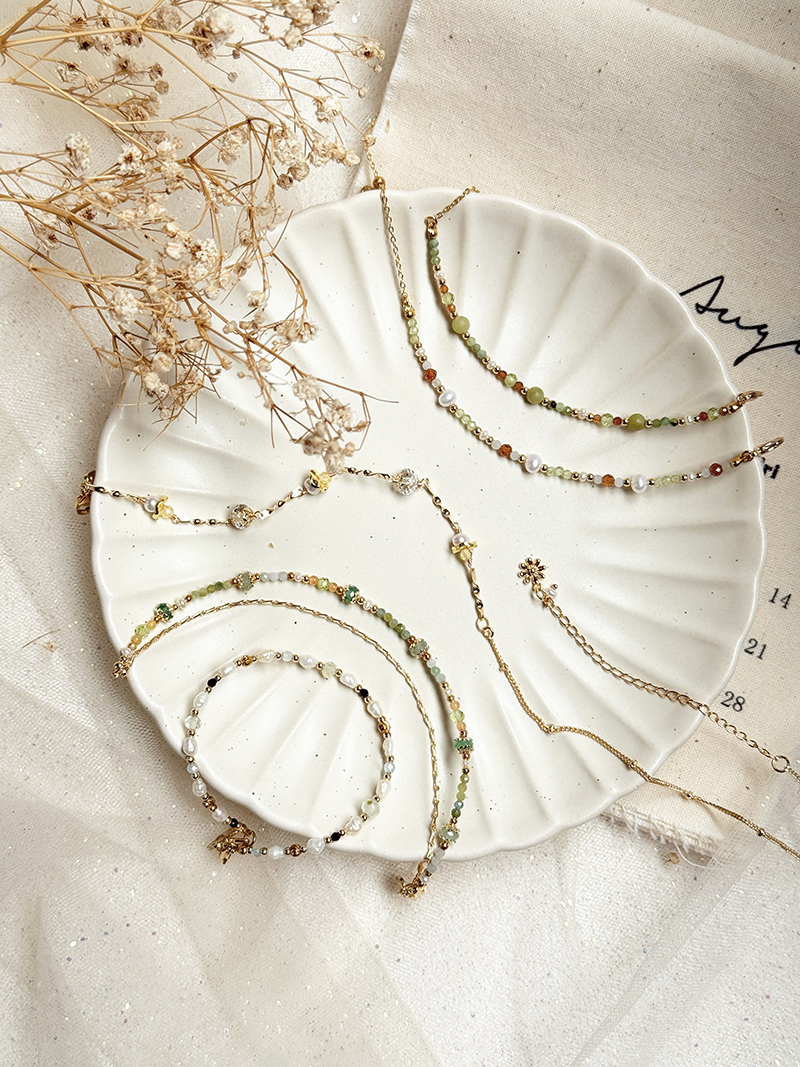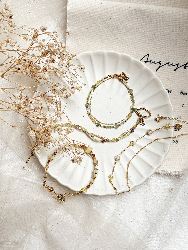 東陵玉、印度綠瑪瑙、黃玉、橄欖石、緬甸玉、綠碧璽、淡水珍珠、黃銅鍍18K金