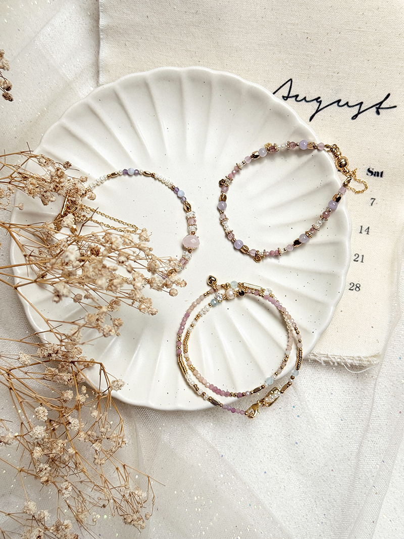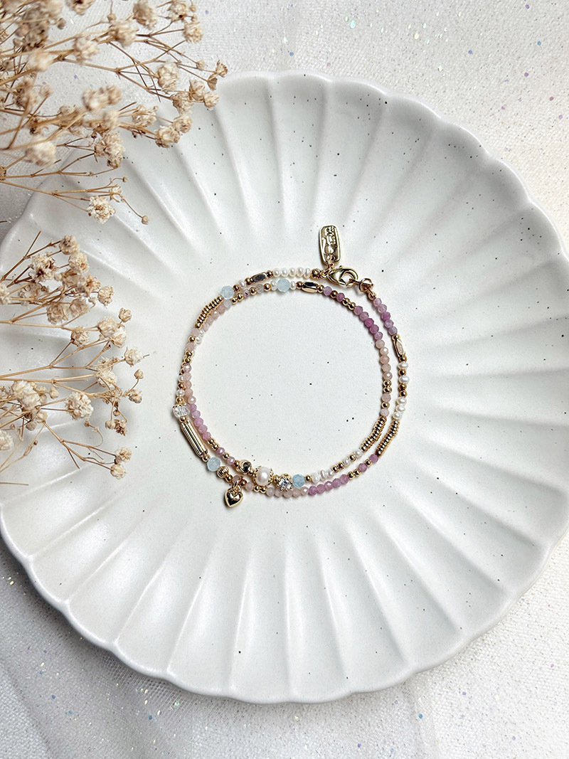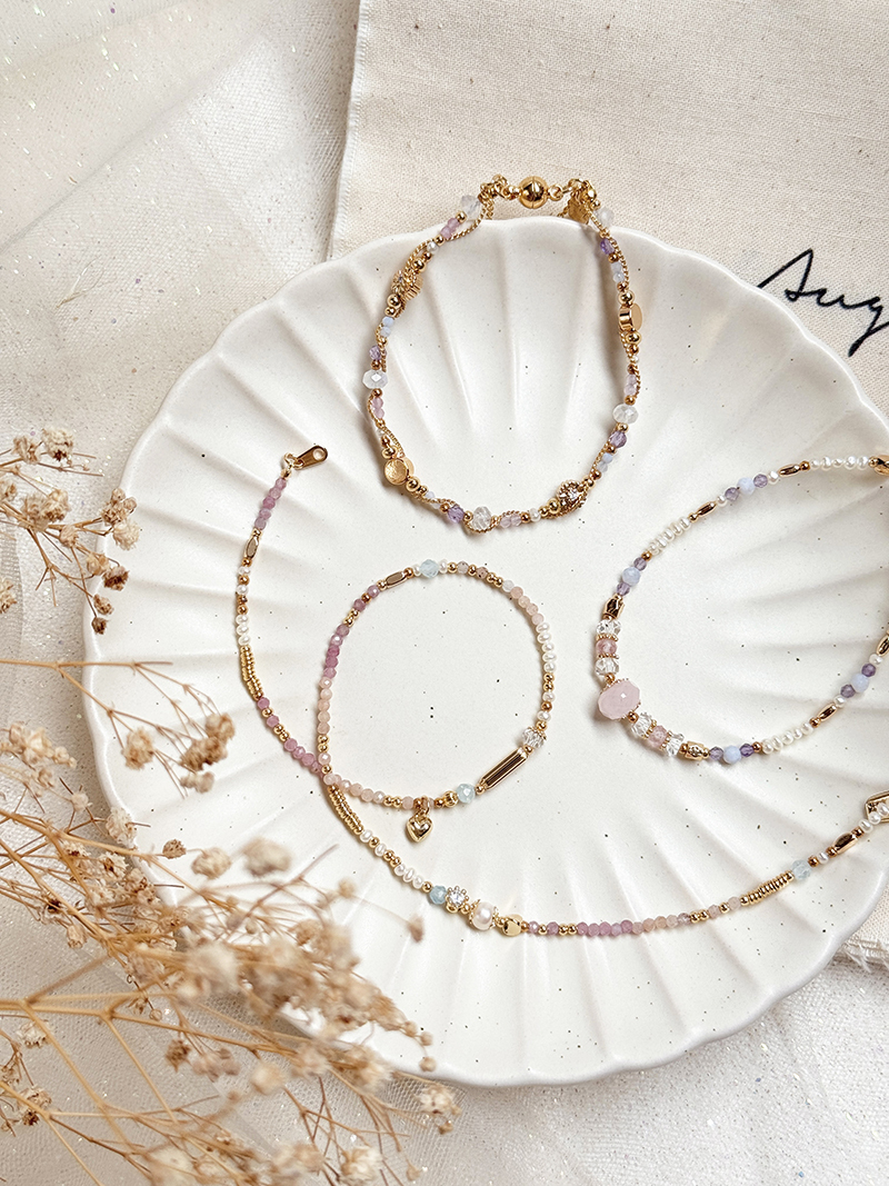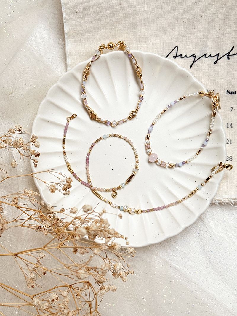 粉碧璽、太陽石、淡水珍珠、海藍寶、白水晶、黃銅鍍18K金