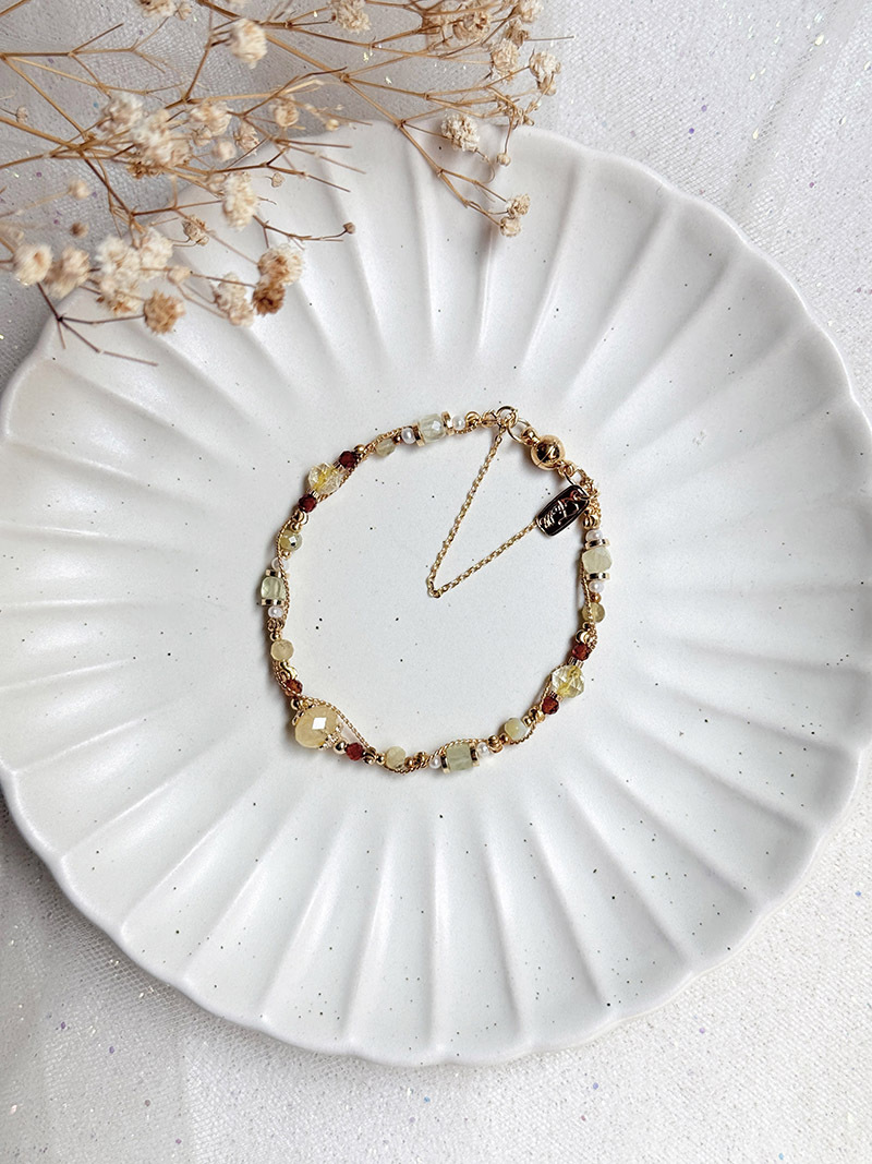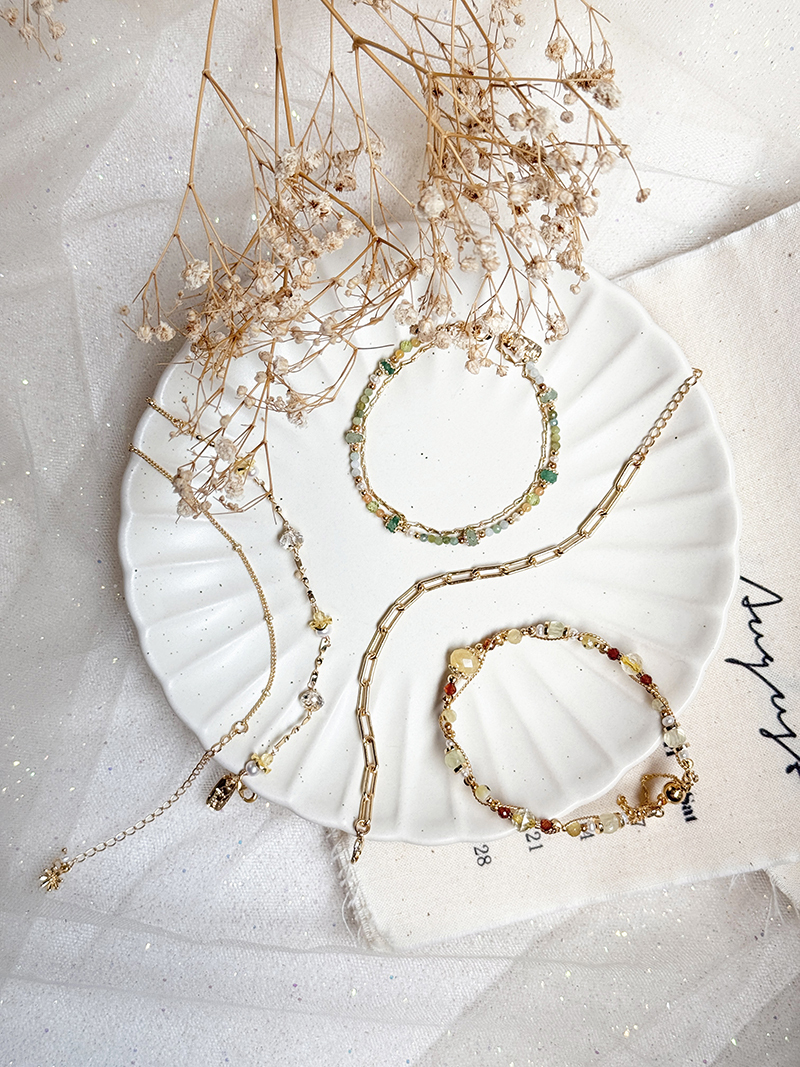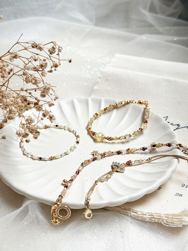 黃水晶、橙石榴石、黃蛋白石、淡水珍珠、葡萄石、黃銅鍍18K金