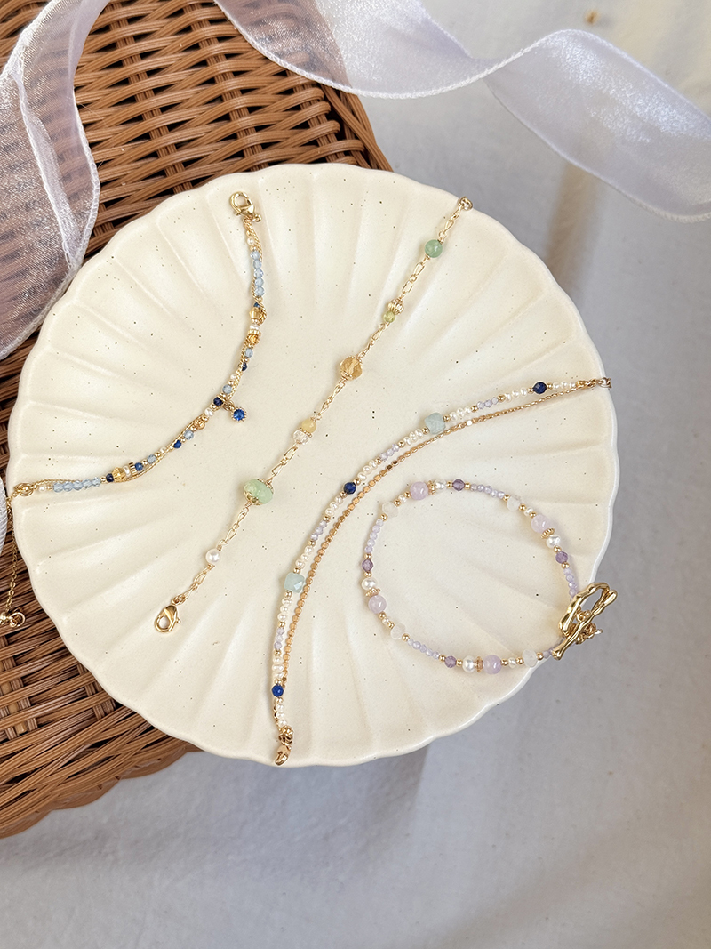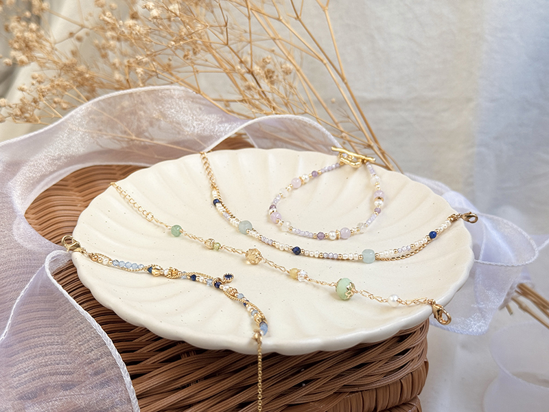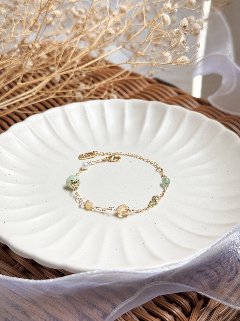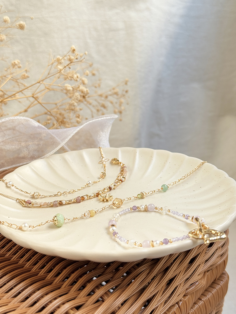玉石、黃水晶、淡水珍珠、東陵玉、橄欖石、白水晶、黃蛋白石、黃銅鍍18K金