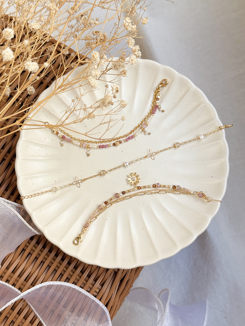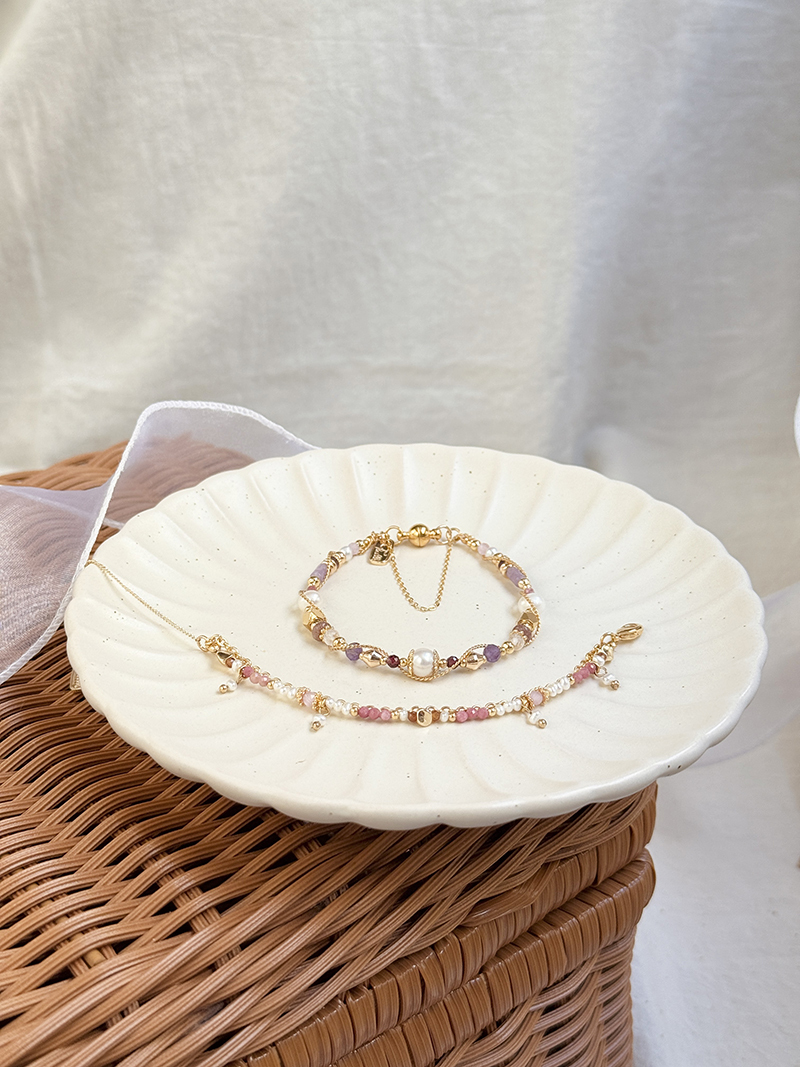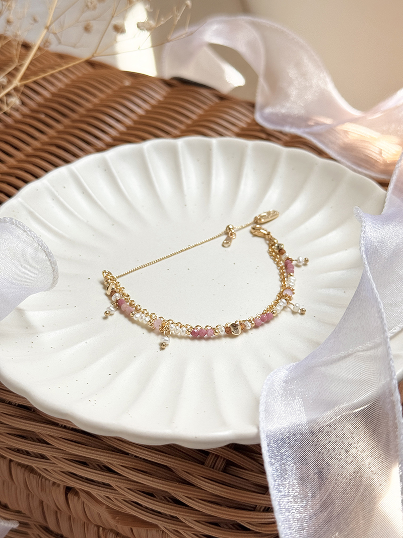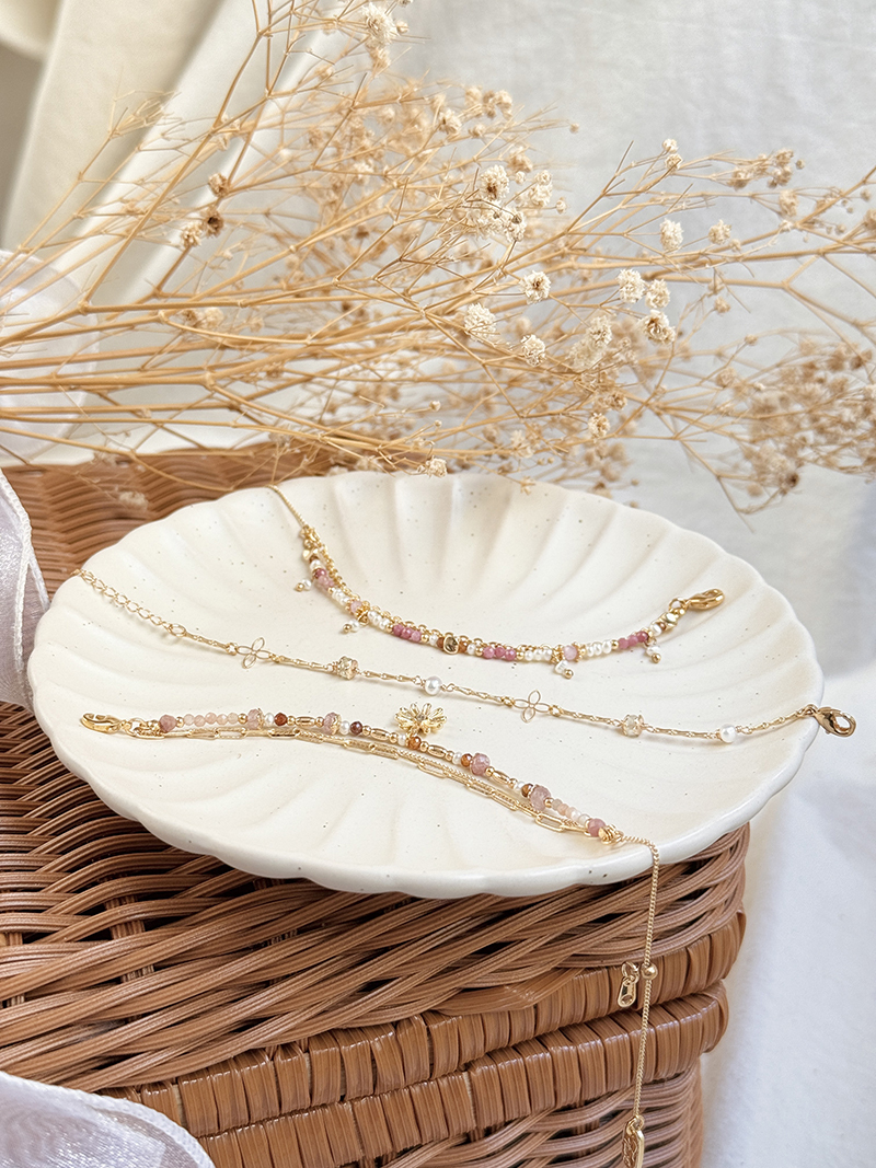 粉貓眼石、紅紋石、橙石榴石、淡水珍珠、黃銅鍍18K金