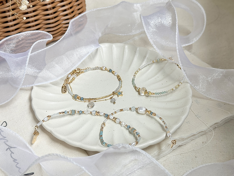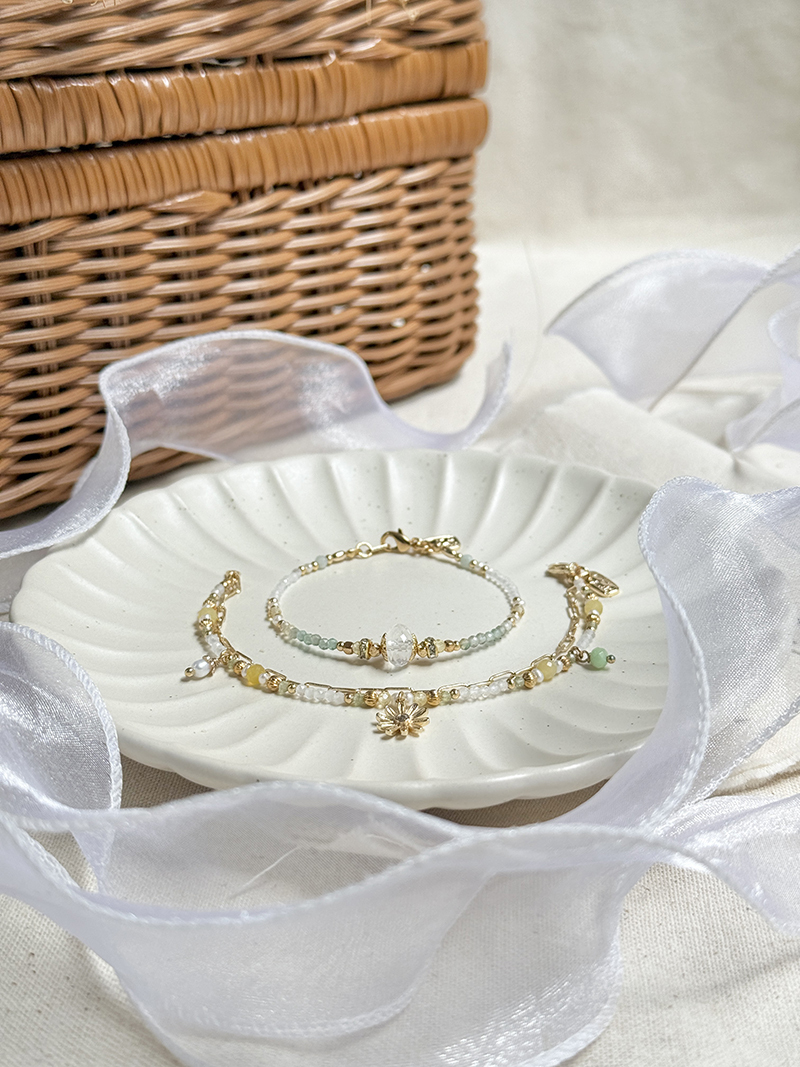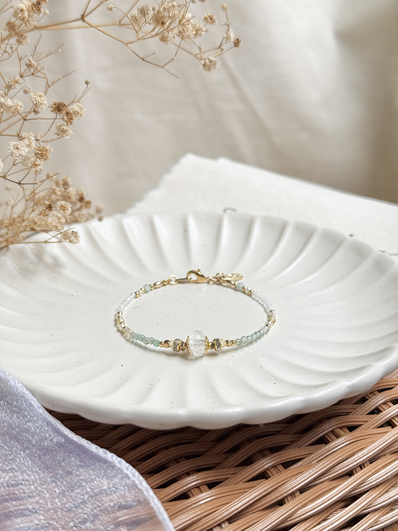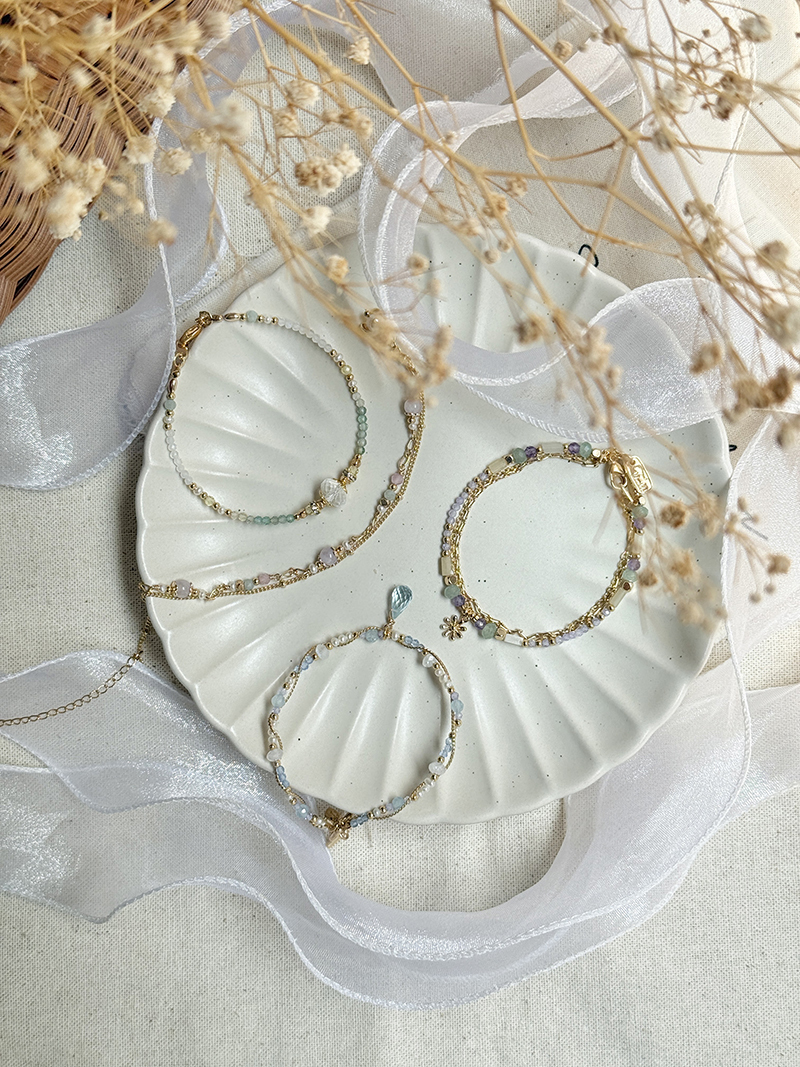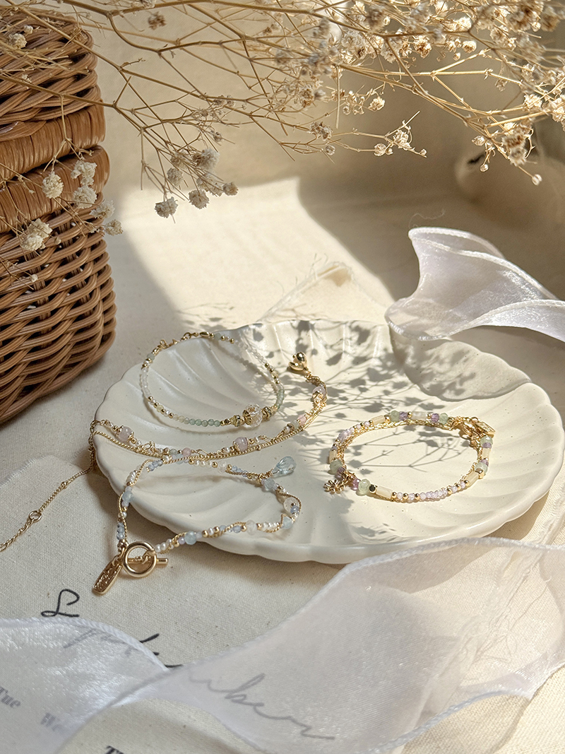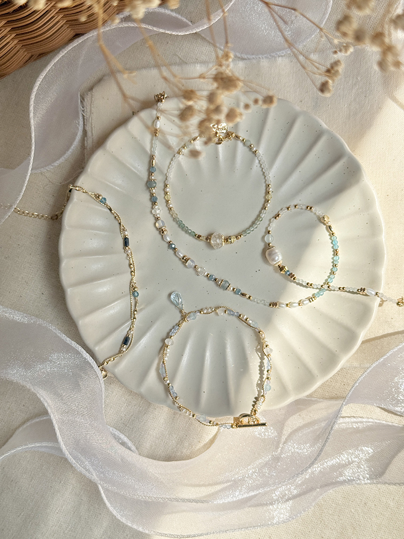 白水晶、黃水晶、黃綠水晶、月光石、淡水珍珠、緬甸玉、鋯石、黃銅鍍18K金