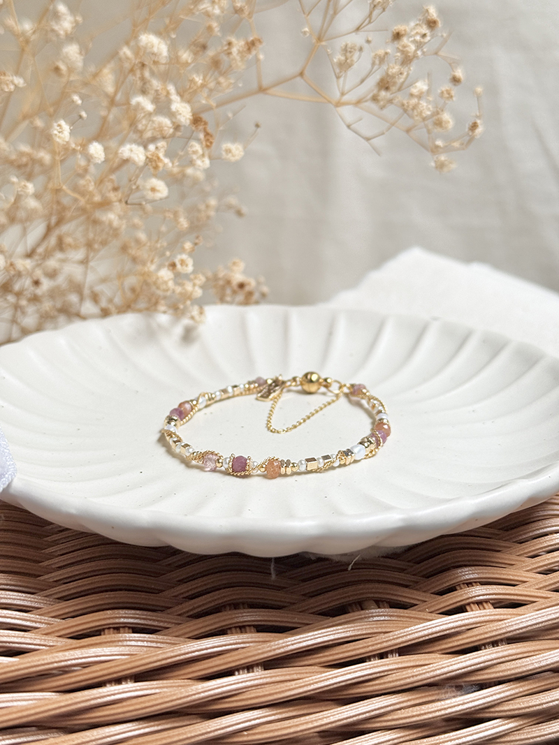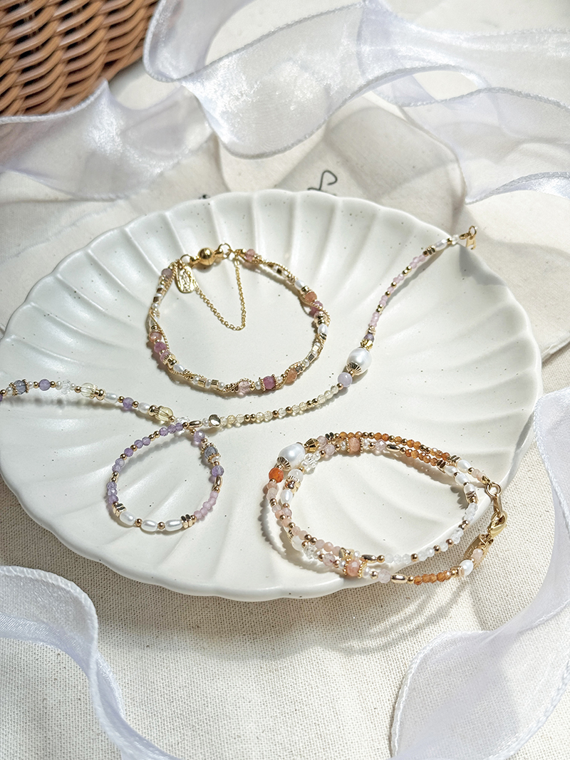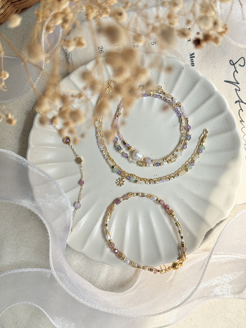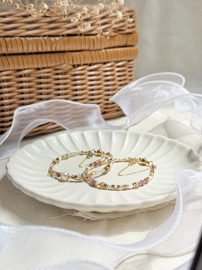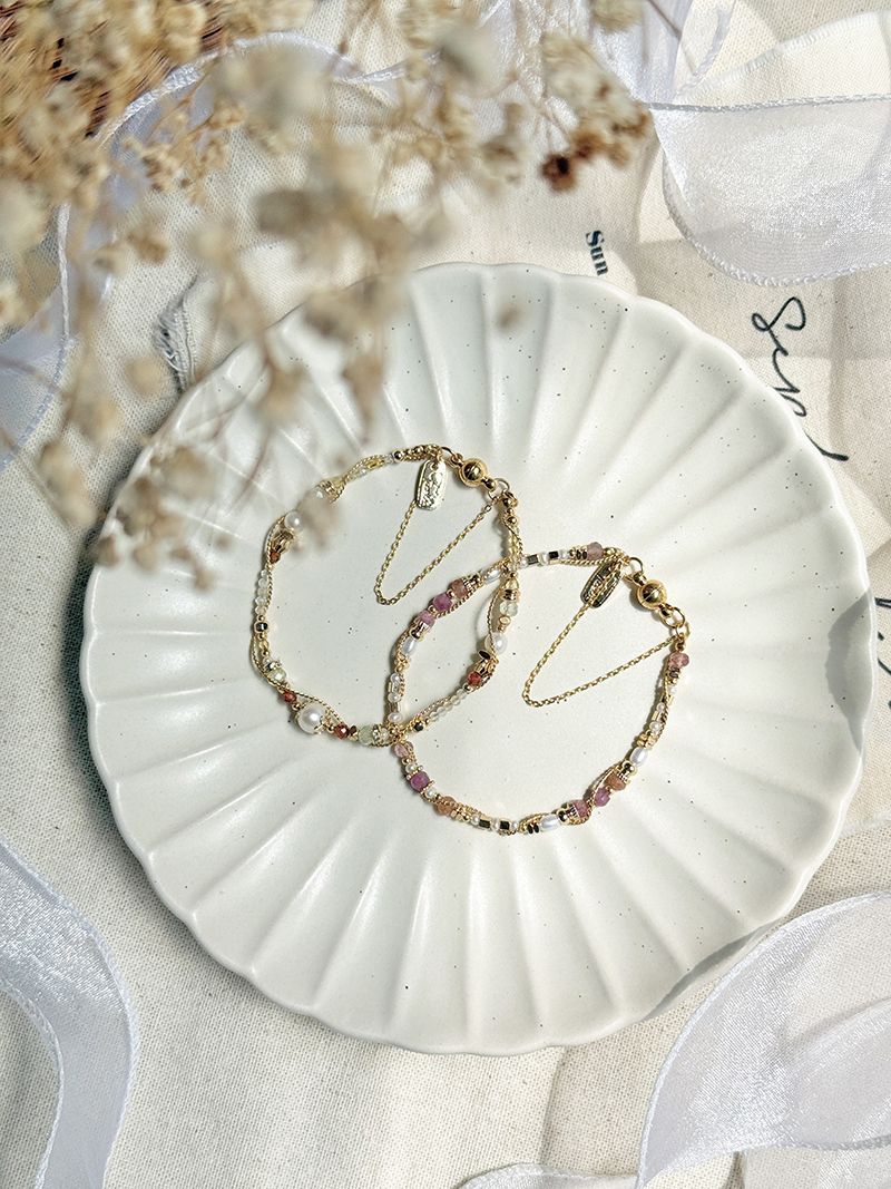 粉碧璽、金草莓晶、草莓晶、淡水珍珠、黃銅鍍18K金