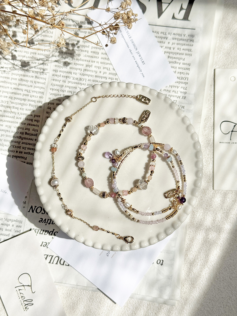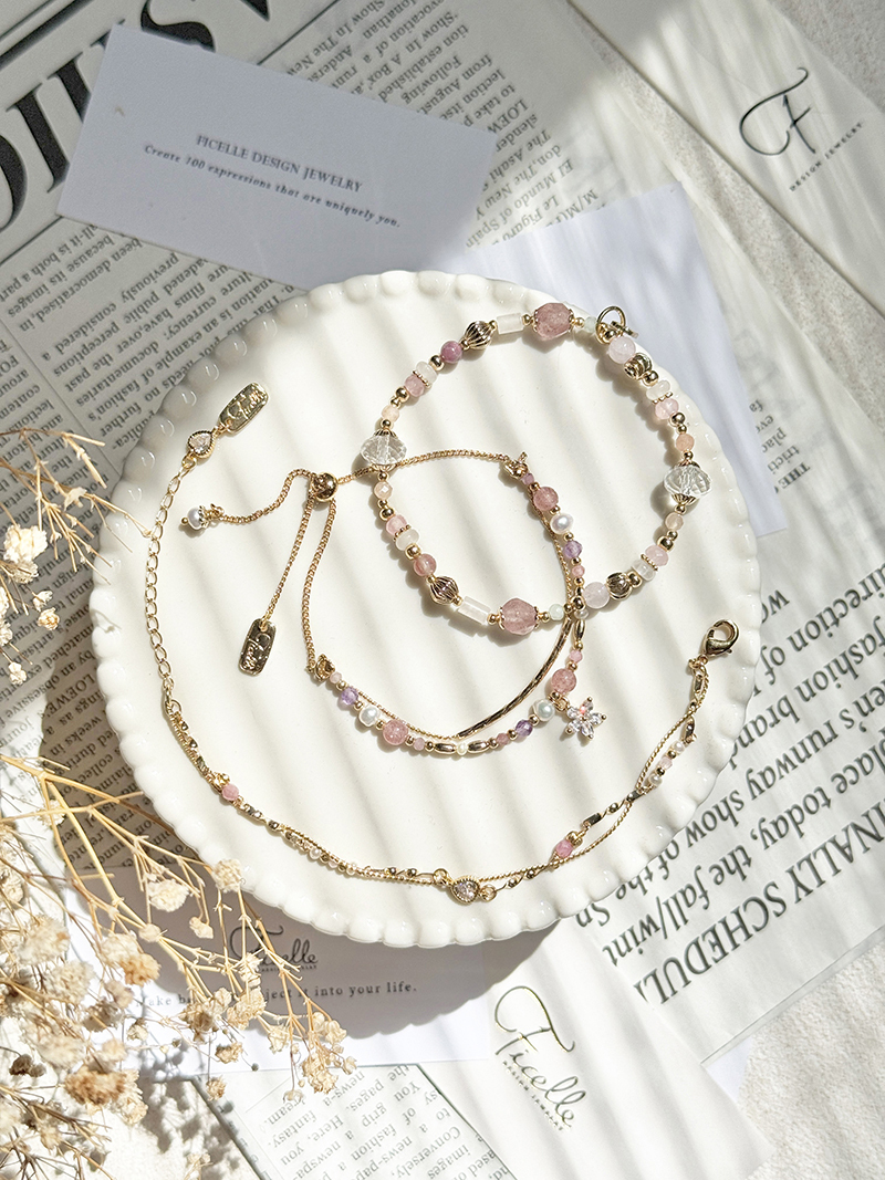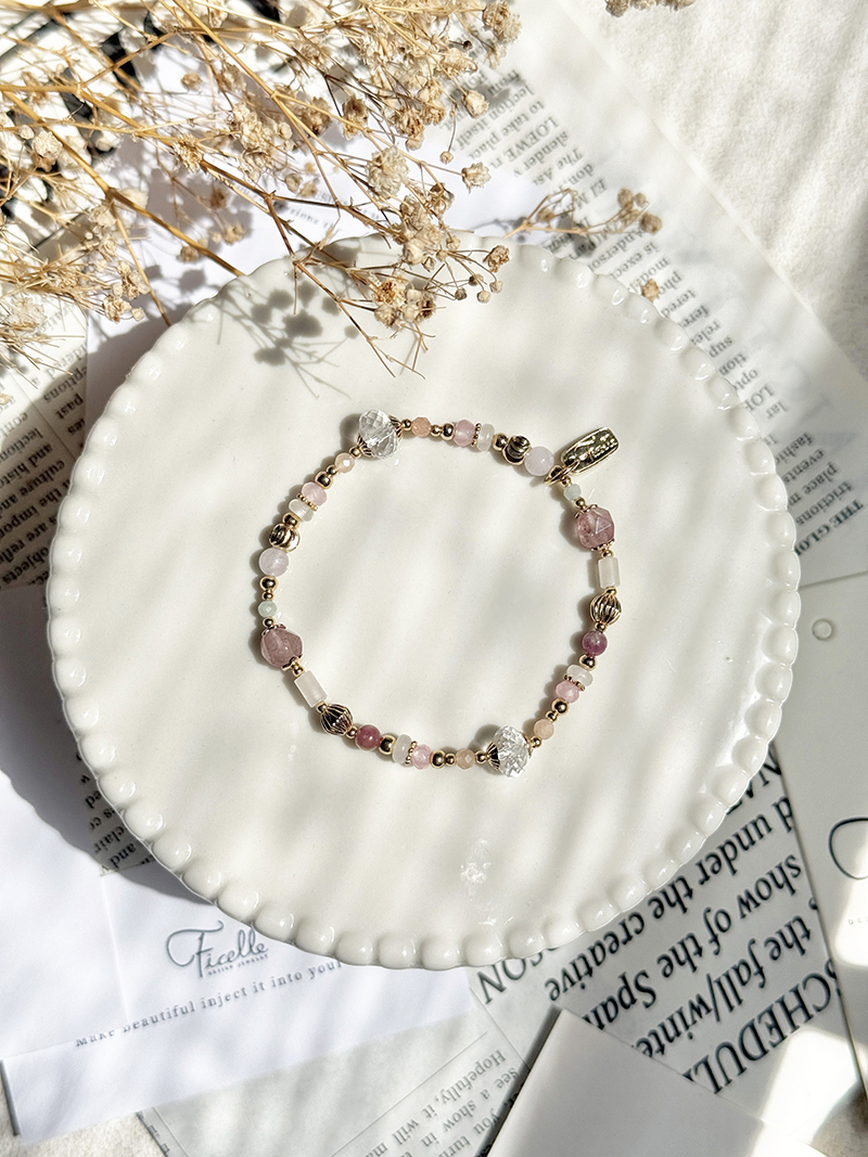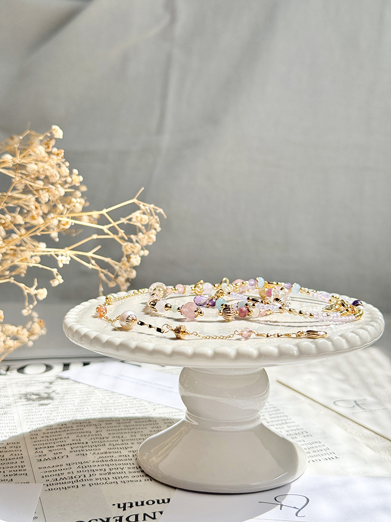 白水晶、太陽石、草莓晶、粉碧璽、白玉、粉晶、緬甸玉、黃銅鍍18K金