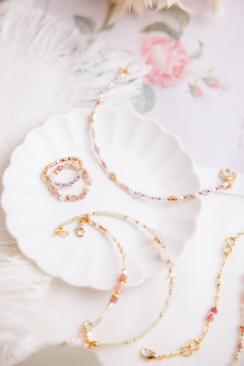 淡水珍珠、粉碧璽、紫水晶、黃銅鍍18K金