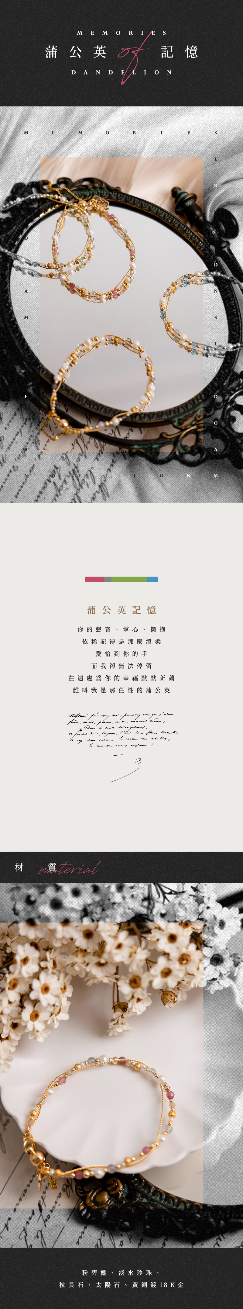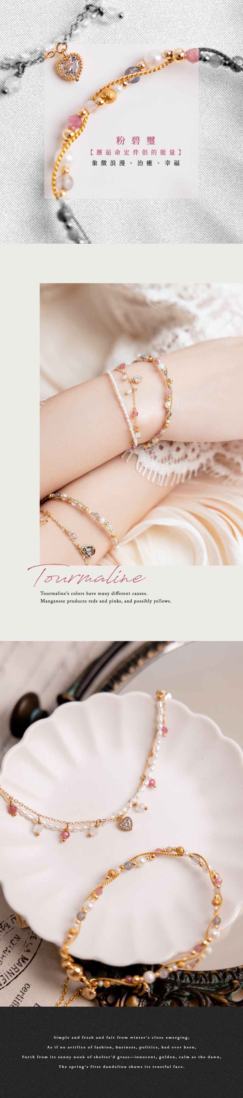 粉碧璽、淡水珍珠、拉長石、太陽石、黃銅鍍18K金