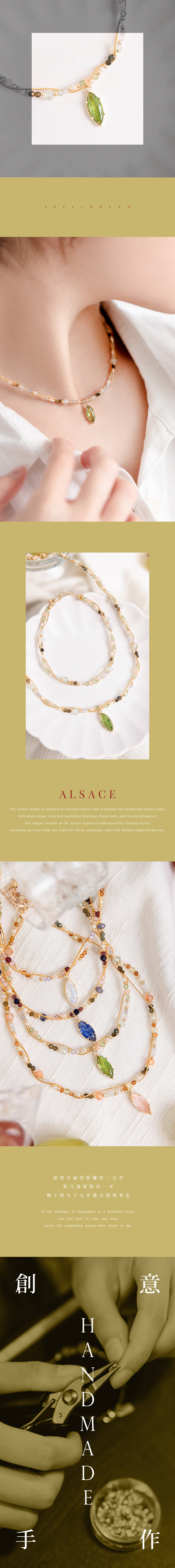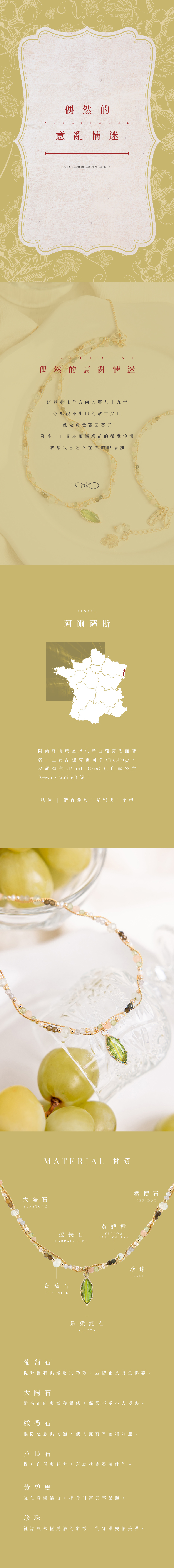 葡萄石、金箔綠鋯石、太陽石、橄欖石、拉長石、黃碧璽、淡水珍珠、黃銅鍍18K金