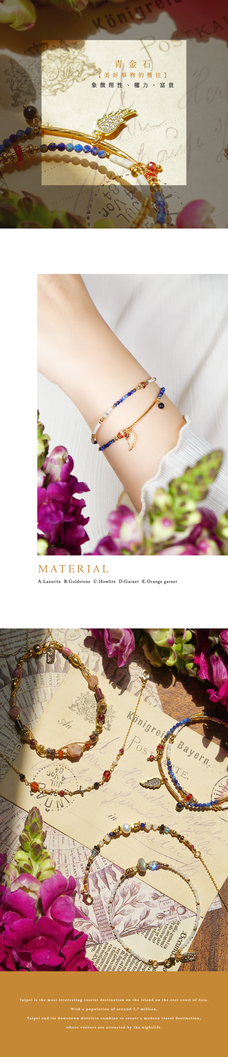 青金石、白紋石、石榴石、黃銅鍍18K金