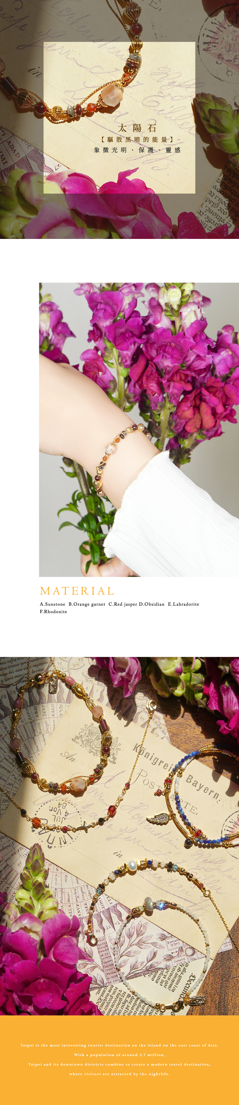 太陽石 Sunstone:增加親和力,對應太陽能量中心,激發無限靈感,擁有強大的正面能量,可以防小人與辟邪很好的幸運寶石與護身符。