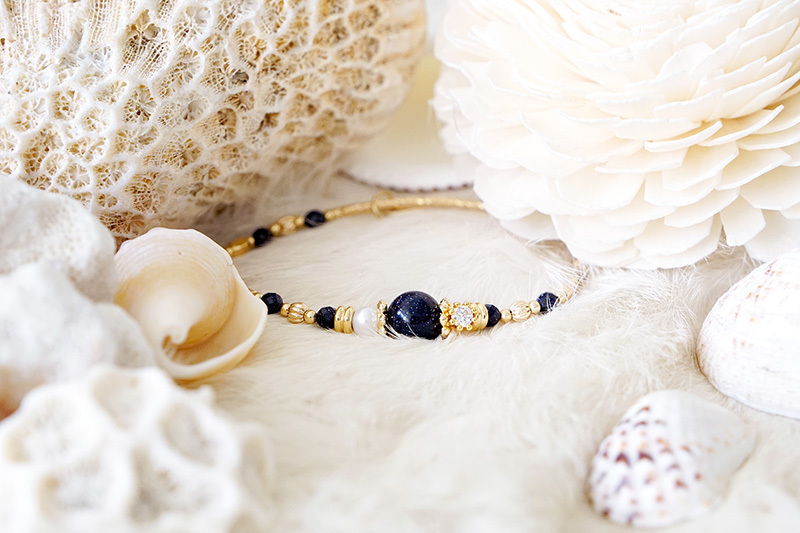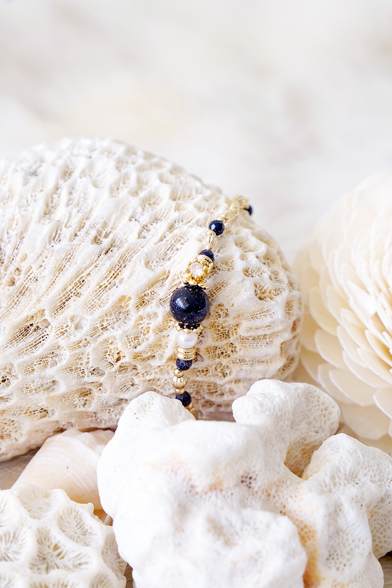 藍金沙、鋯石爪鑽、淡水珍珠、黃銅鍍18K金